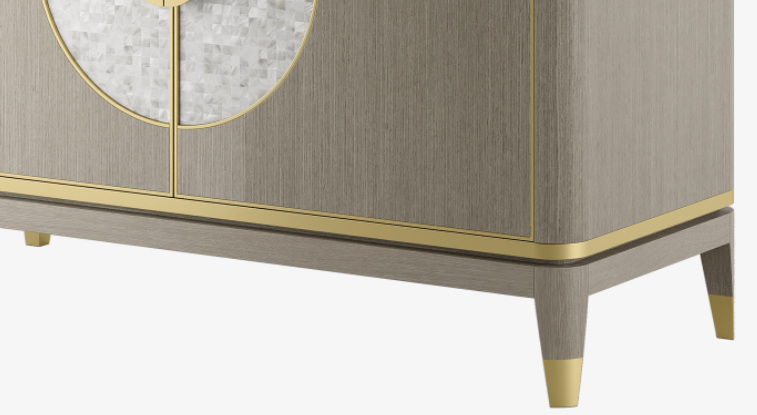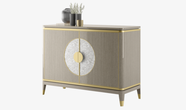 The striking SEVILLE cupboard uses elegant materials to elevate a pared-back silhouette. Crafted from glossy wood veneer, details of brushed brass and a circular inlay of white mother of pearl catch the light and the eye.