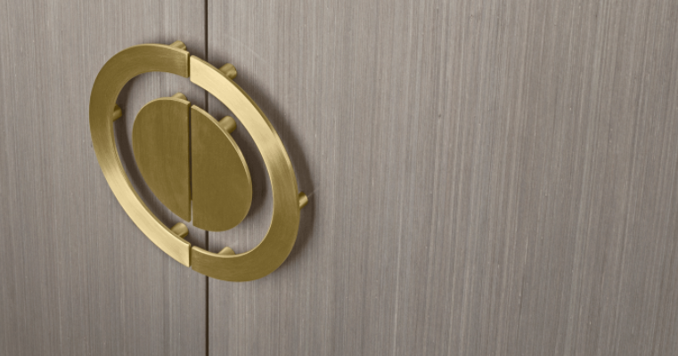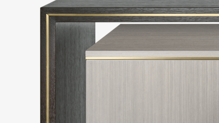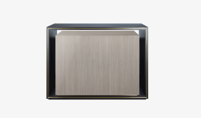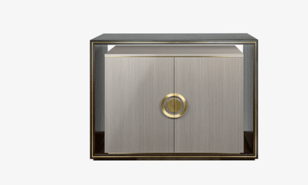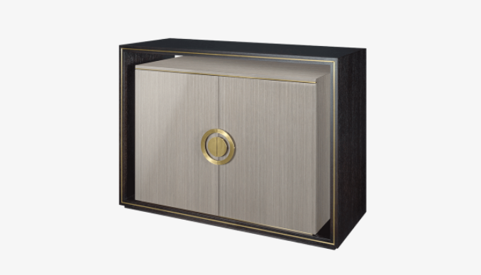The unique SYROS cupboard eschews legs or a base in favour of a frame-like surround crafted from dark wood veneer. This borders a clean-lined cupboard in paler, glossier veneer, while elements of brushed brass unify the two.