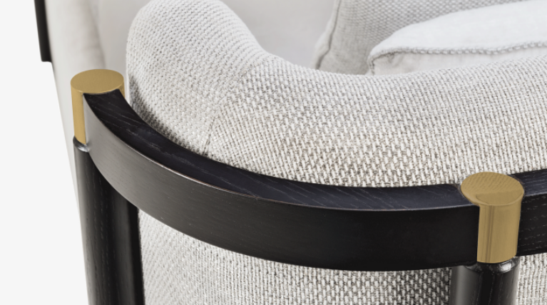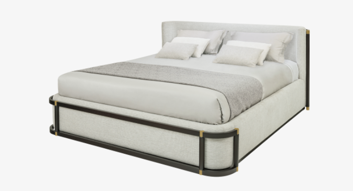 The smart COMO Bed contrasts soft, linen upholstery with a decorative, architectural framework that sits at the foot and head of the design. This is crafted from a blend of solid wood accented with elements of lustrous brushed brass.