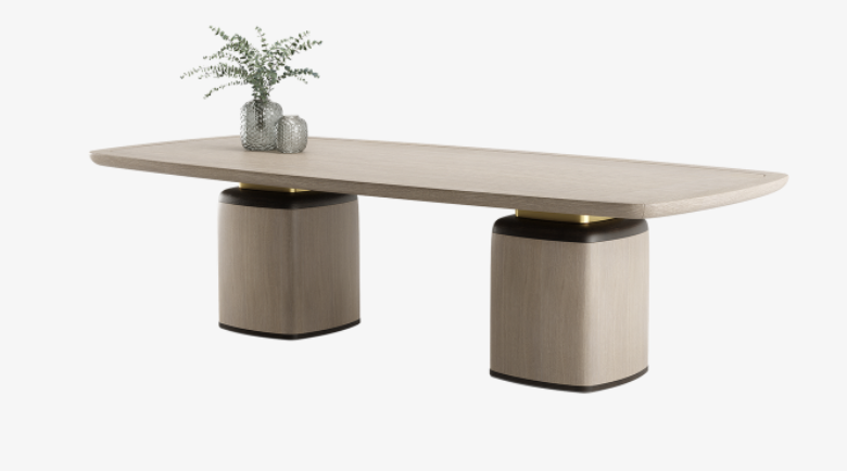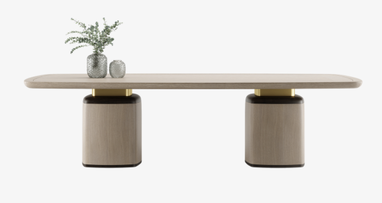 The majestic NAGANO dining table takes its moniker from the Japanese city, which is renowned as a hub of spiritual sites and natural splendour. Predominantly finished in soft grey wood veneer its embellishments of darker wood and brushed brass amplify the dining table’s stately silhouette.