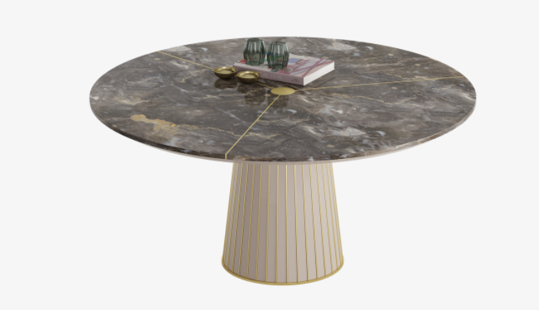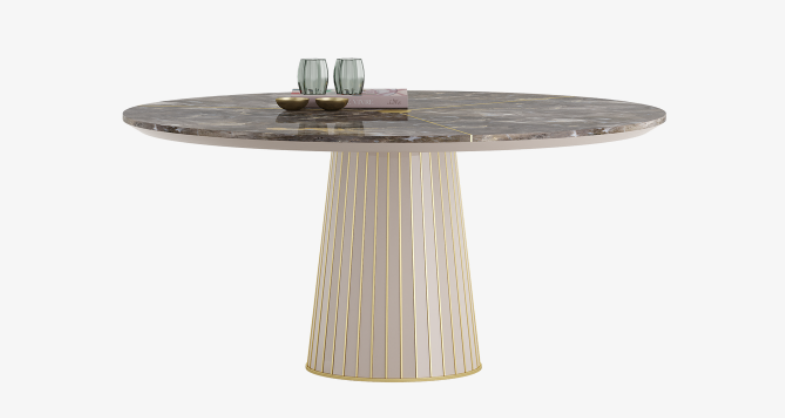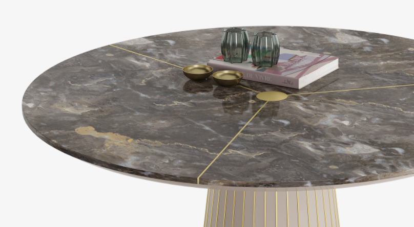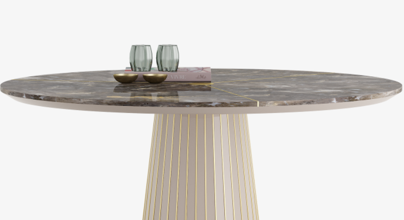 The darkly dramatic PINOT II Dining Table’s impact is instantaneous. Together, the well-proportioned circular top with its discreet metallic details, and pared-back pedestal base embellished with a graphic framework, create a modernist silhouette that mesmerises in its minimalism.