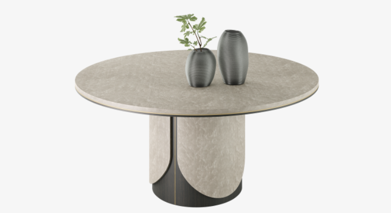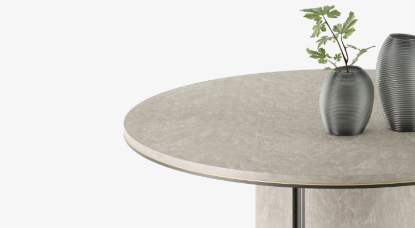 The stylish TREVISO design adds a contemporary twist to the form of a classic circular dining table with pedestal base, playing with dark and pale wood veneer to create an optical illusion that hints at an alternative silhouette.