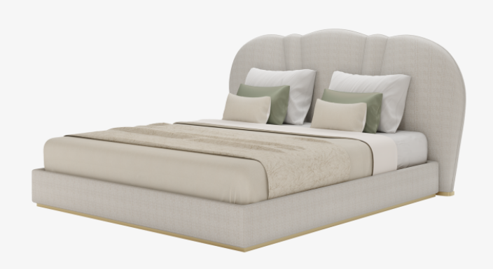 "Clean lines and sweeping curves combine in this sumptuous SAMARA bed, which draws on Art Deco style to infuse its statement design with a timeless quality. Upholstered in a soothing natural shade, the bed sits atop a brushed brass base, exuding warmth and luxury. "
