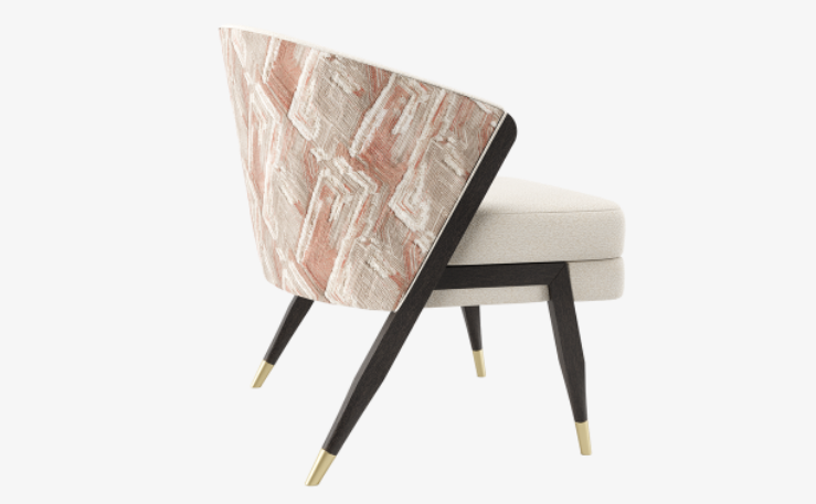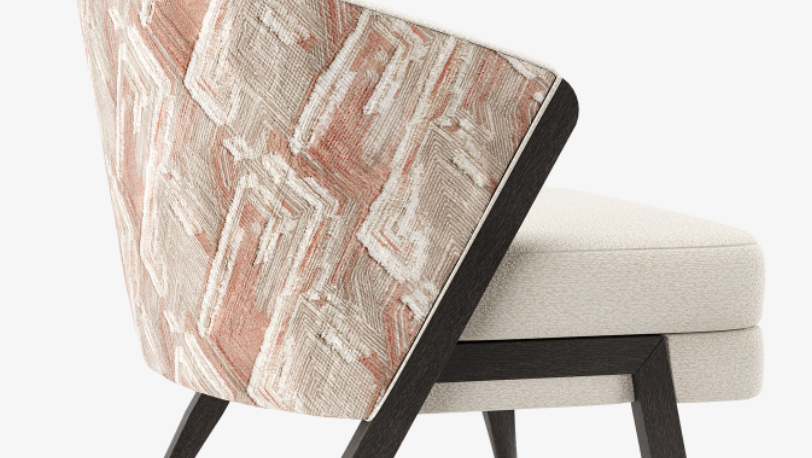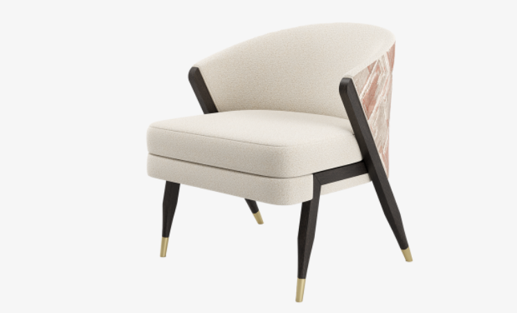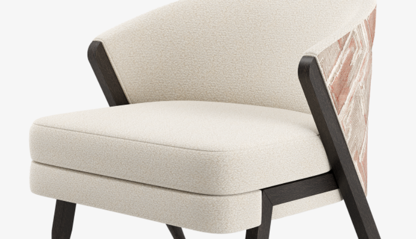 Pristine white upholstery emphasises the dark wood veneer frame of the CARMEL armchair, highlighting the way the armrest flows seamlessly into the leg line.