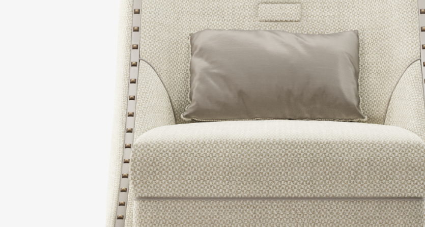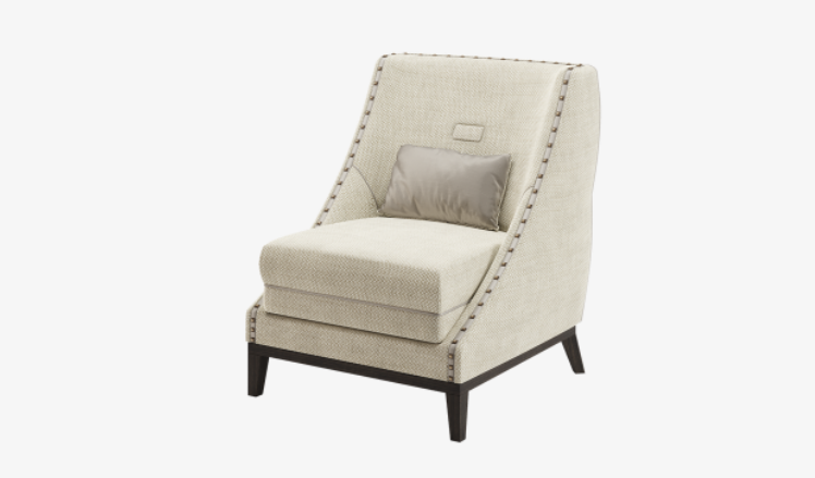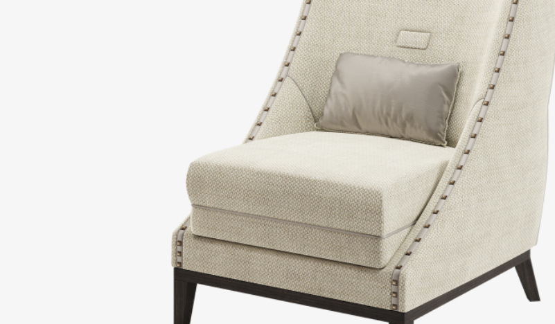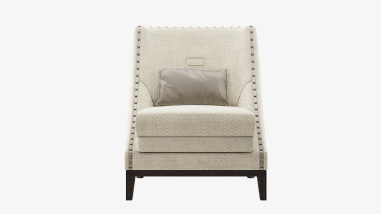 Named after America's Motor City, the distinctive DETROIT armchair gently references bucket seats in its assertive silhouette and condensed solid wood base. The design's deep seat cushion and single upholstery fabric is further elevated with satin piping and squared studs.