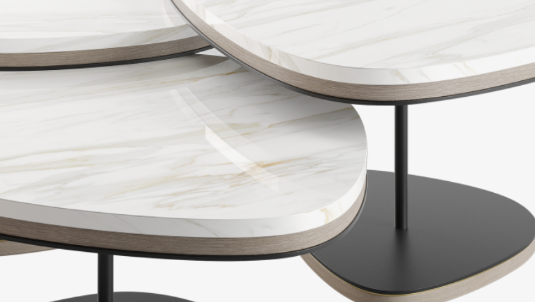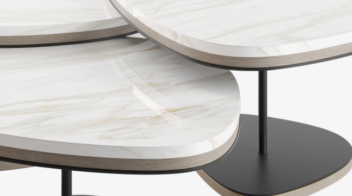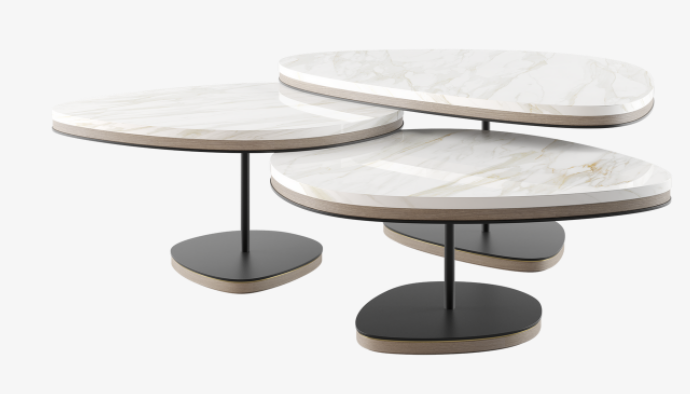 Reminiscent of a cascade of pebbles, the graceful ANTWERP introduces a more natural, organic shape to our collection of coffee tables. A trio of overlapping volumes, the design fuses lustrous white stone, wood veneer and painted iron with elements of brushed brass.