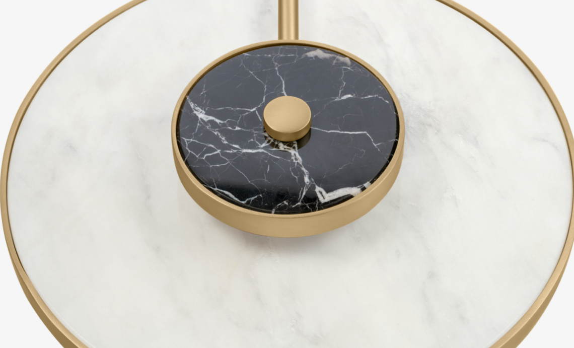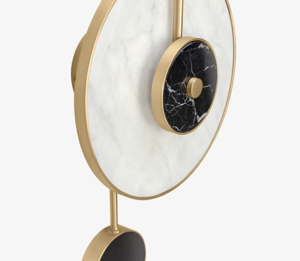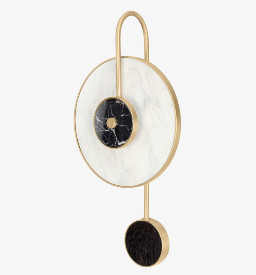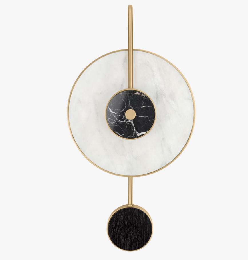 Circles are given a fresh outlook through the use of different materials in the KANDY Wall Lamp, which incorporates contrasting marbles, brushed brass and wood veneer.