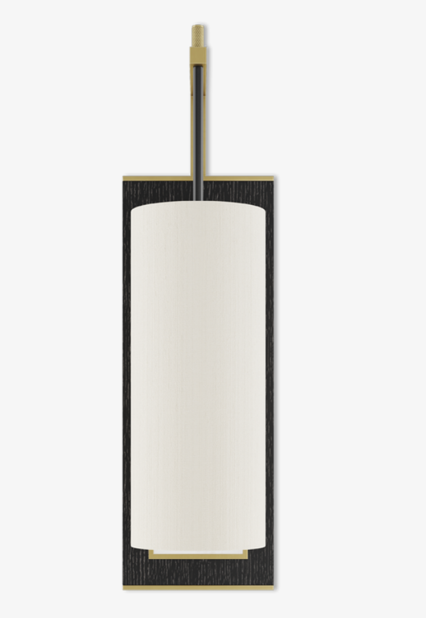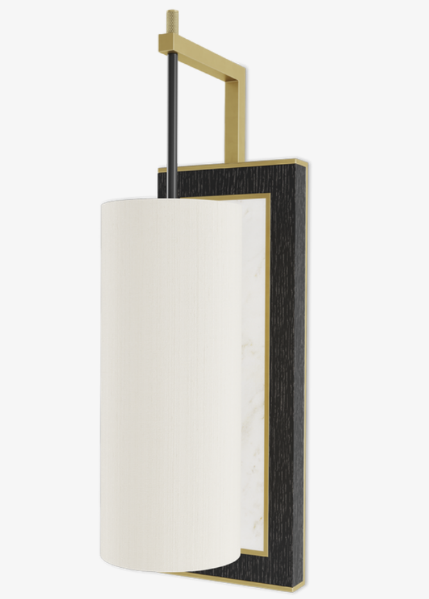 Free up bedside space with a wall-hung lighting design such as the KASSEL lamp, which features a back panel of wood veneer, brass and stone, and a cylindrical shade in double silk.