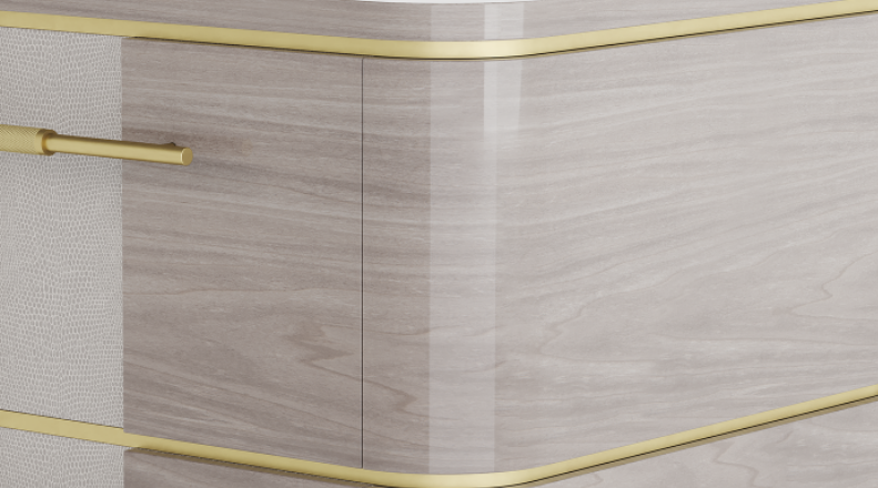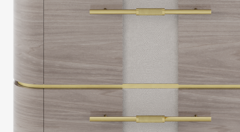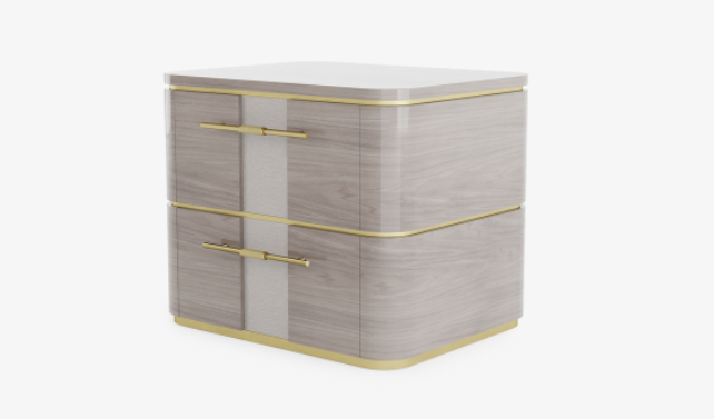 A softly edged cube shape, the AGRA bedside table integrates a surprising rich material mix into its well-ordered design. Predominantly Crafted from glossy wood veneer, it accessorises with a stone surface, brushed and knurled metal handles and leather insets on its two suede-lined drawers.