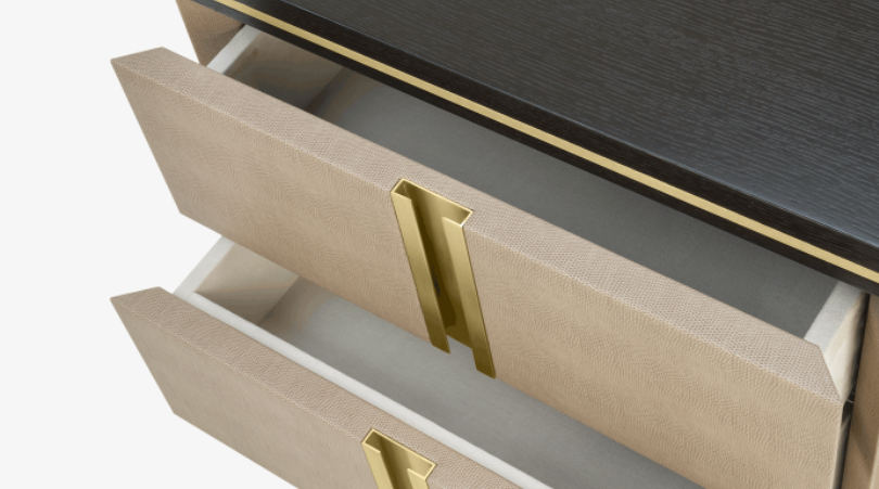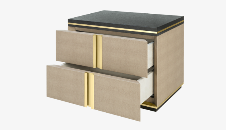 The cube-shaped AVIGNON Bedside Table incorporates two suede-lined drawers, both finished in leather and with inset handles crafted from brushed brass. To the top and bottom, sections of dark wood veneer accented with metallic concludes the design.