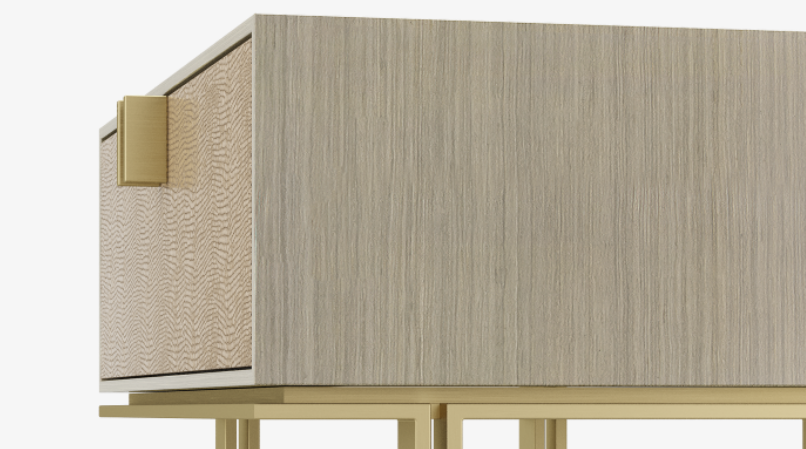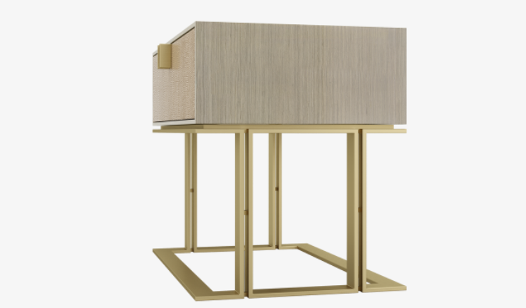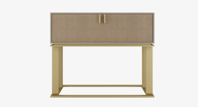 FRATO's master craftsmen let loose their ingenuity when making the BRISBANE bedside table. Comprised of a glossy veneer box with a leather-fronted, suede-lined drawer, this portion of the design appears to hover above a sculptural base skilfully constructed from four sections of brushed brass.