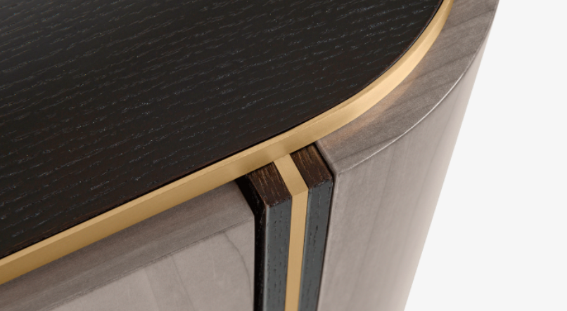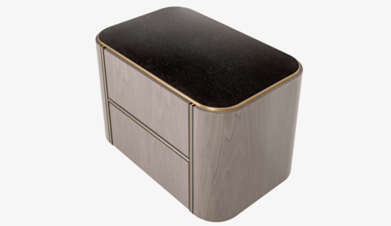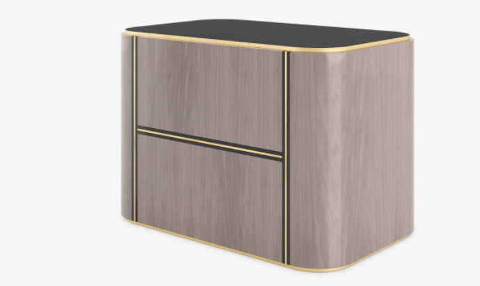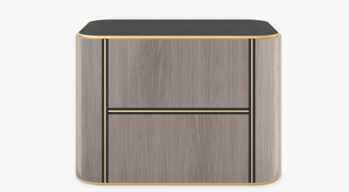 A curved cube, the sleek KENT Bedside Table features two suede-lined, handle-free drawers outlined in dark wood veneer and brushed brass. These stand out against the design’s grey veneer facade, creating a H-shaped pattern to the front.