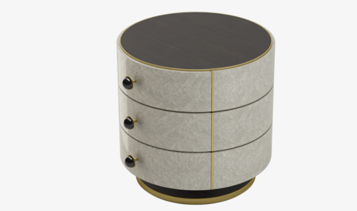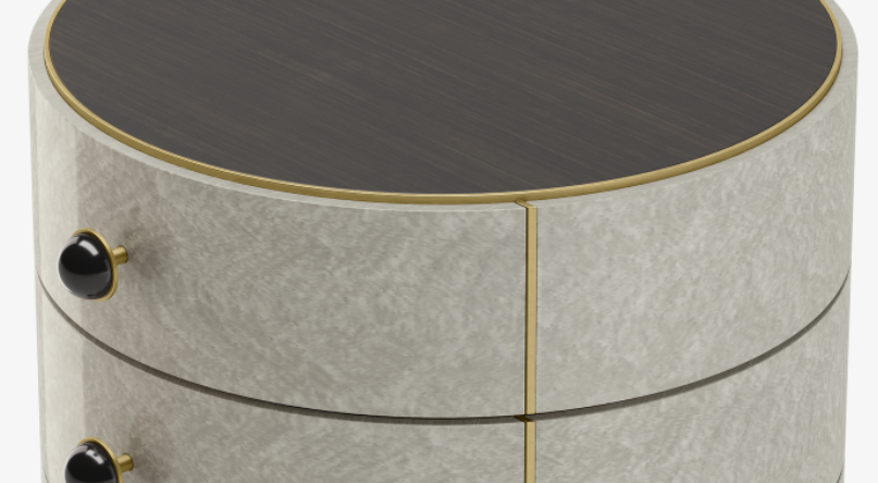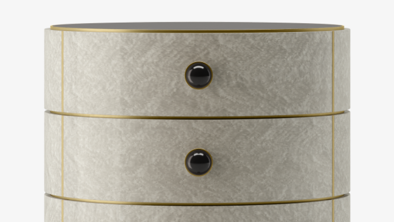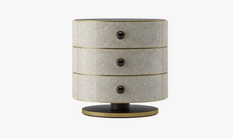 A curvaceous silhouette and pedestal base add a sense of poise to the three-drawer PARMA Bedside Table’s utilitarian character, while the design’s lustrous wood-veneer front is punctuated by three gem-like handles that tempt the touch.