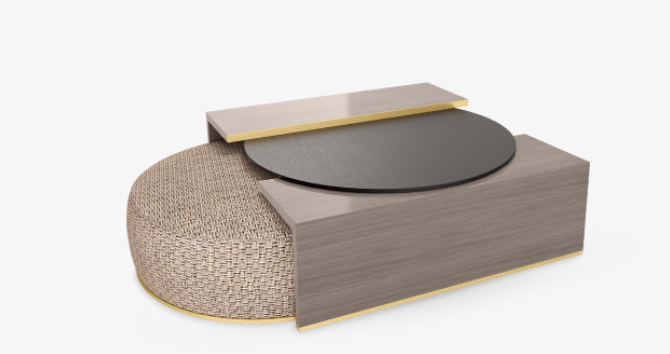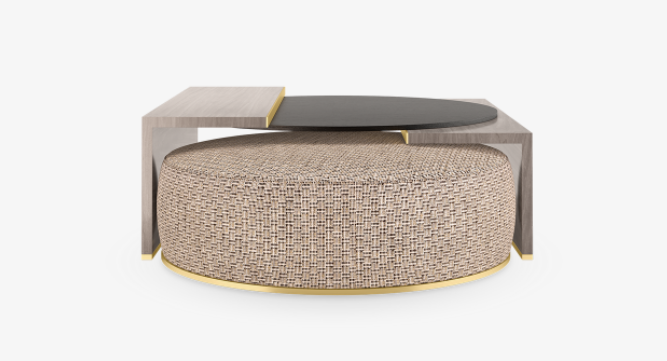 One of most fashion-forward pieces, the MAINE design offers two for one. The geometric coffee table, crafted from contrasting wood veneers with metallic trim, has a postmodern vibe, while an upholstered circular seat slots casually underneath.