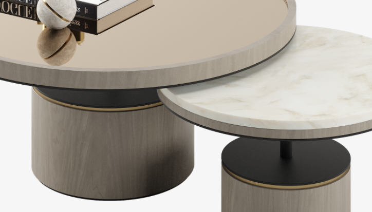 A dynamic duo, the PAROS Coffee table’s two distinct volumes share a similar silhouette but a singular material mix. Play around with both pieces, positioning both together in an overlapping formation or placing separately when individual surface space is required.