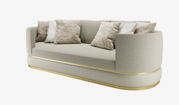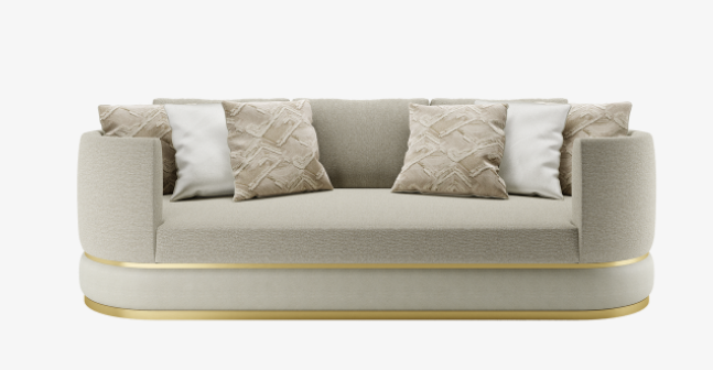 The AREZZO sofa, distinguished base with a band of contrasting woven fabric that is inserted between two strips of brushed brass, with cushioned arms and upholstered in lush velvet, envelop the sitter, providing unparalleled comfort.