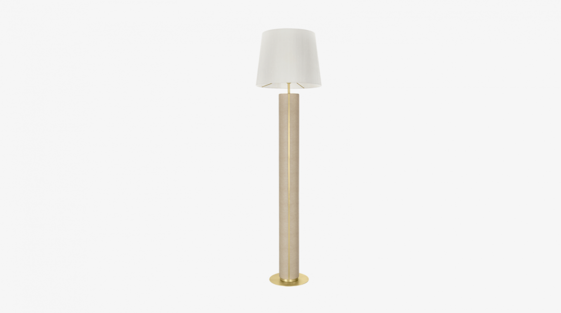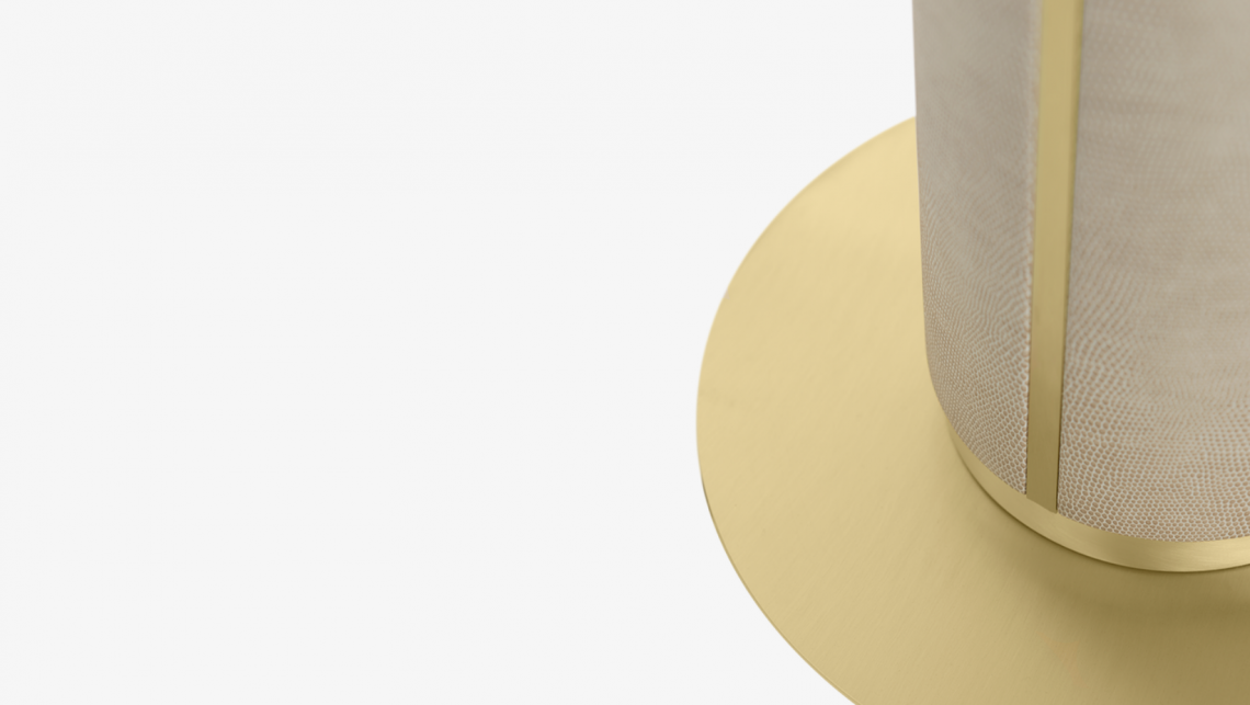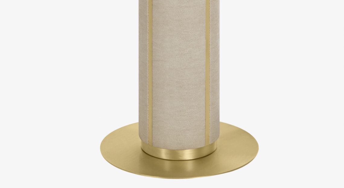 A functional sculpture, the CLOS floor lamp commands attention with a substantial stem crafted from brushed brass and textured leather.
