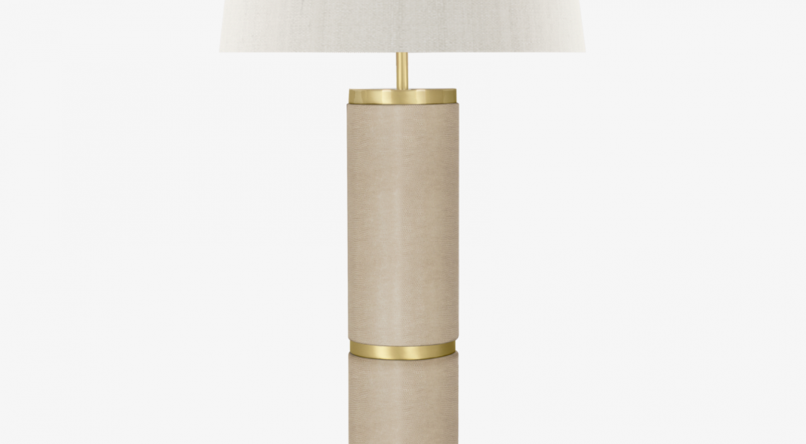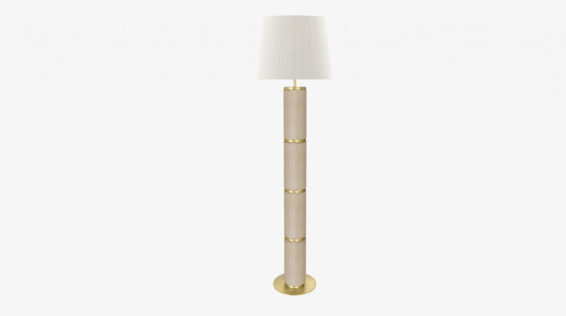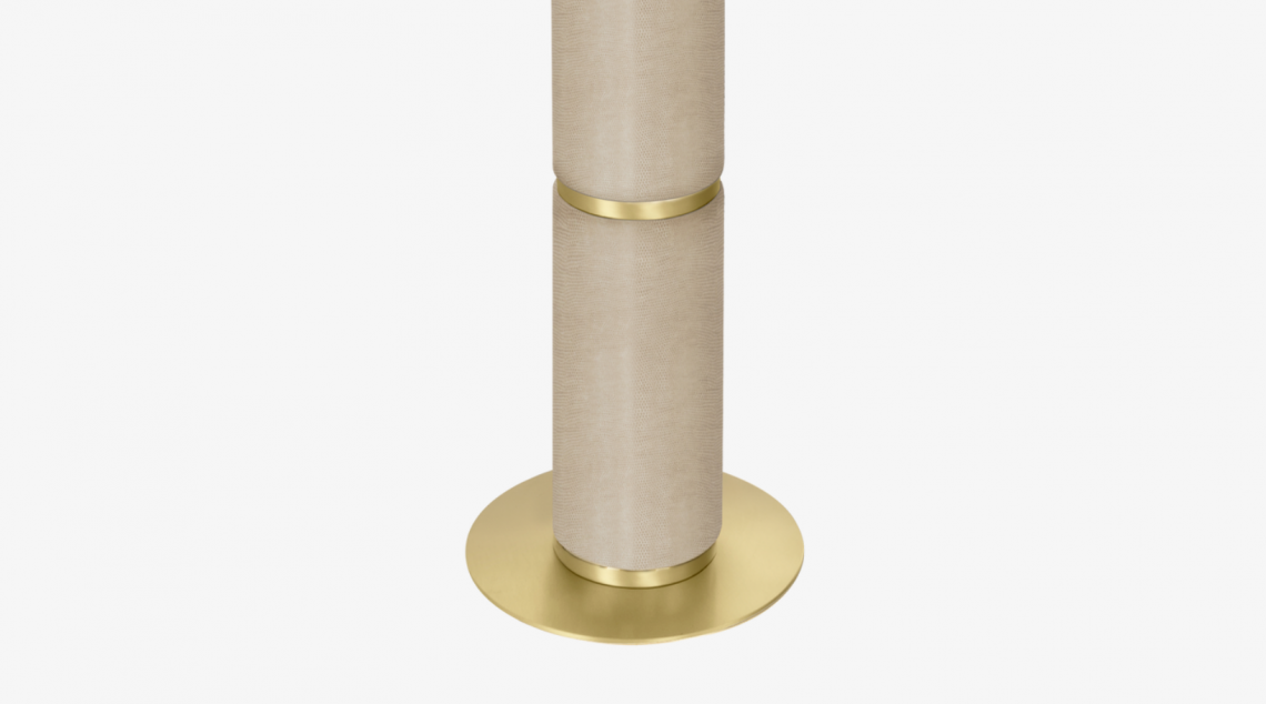 The OMAN floor light owes its statuesque proportions to its tall, totem-like base, which features alternating sections of structured leather and brushed brass.