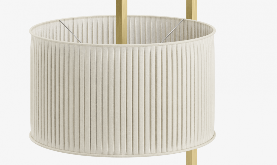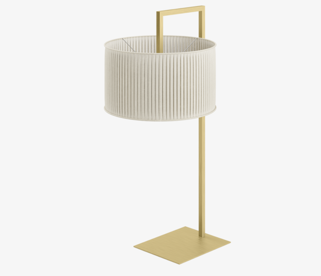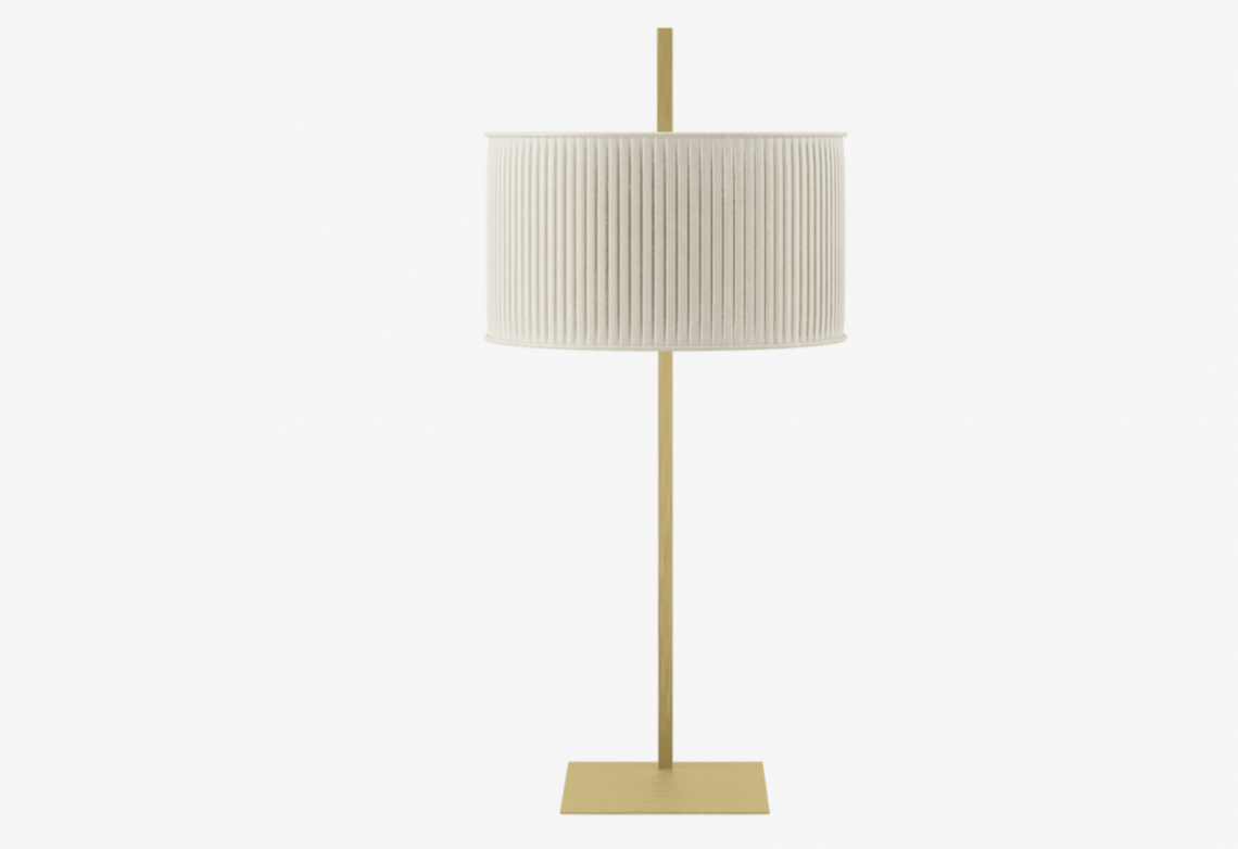 The sleek BRISTOL table lamp plays with balance and proportions to captivating effect. Anchored by a paper-thin brushed-brass base, the angular cantilevered stem suspends a seemingly weightless pleated silk drum shade.