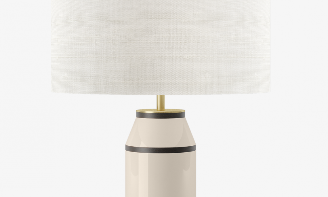 Contrasting sections of brushed brass, wood veneer, lacquered wood and stone form the base of the CACERES Table Lamp, which is topped off with a fabric drum shade.