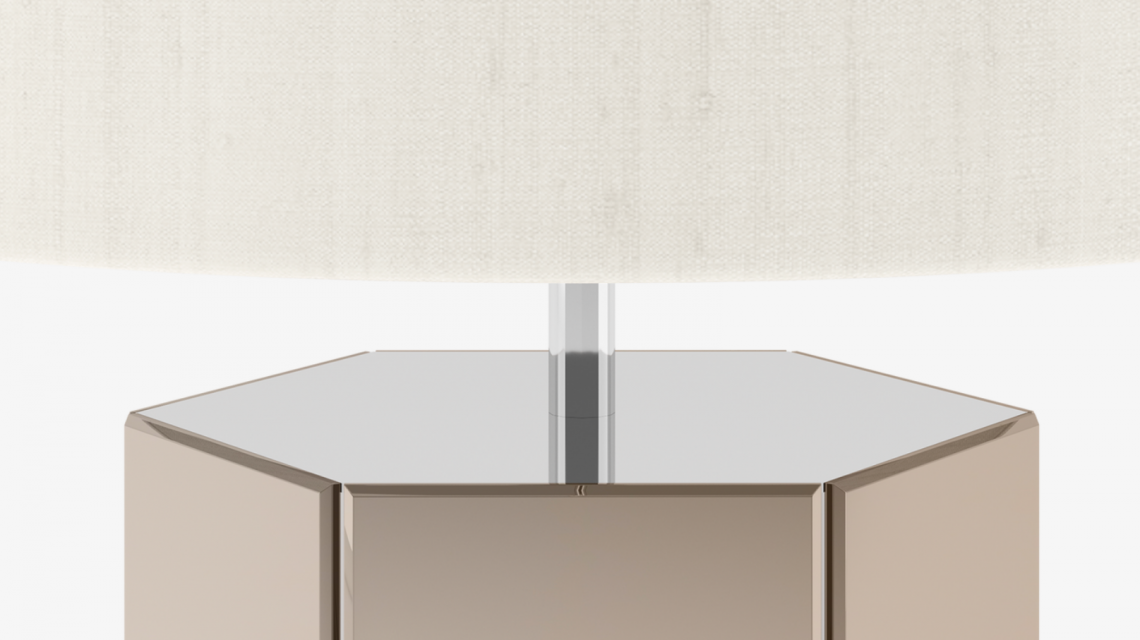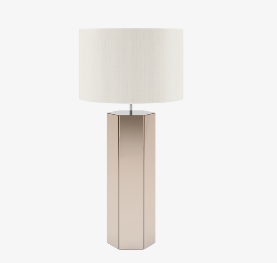 There's no doubt about it, the DUNDEE II table lamp was made to catch the eye. An ample hexagonal stem is topped with a double-silk drum shade and clad in sections of bevelled bronze mirror that reflect fractions of natural or artificial light.