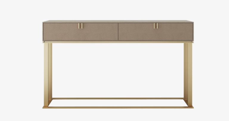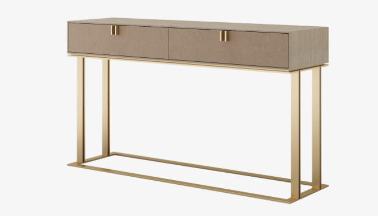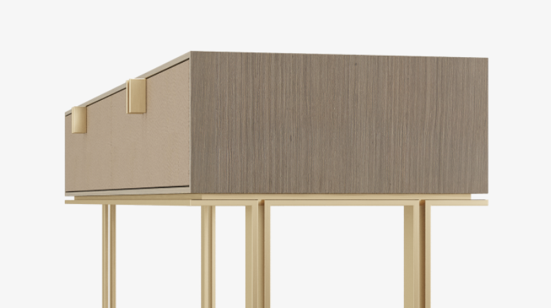 The BRISBANE console combines functional with fabulous. Above, a rectangular box hewn from wood veneer contains two drawers with metal handles and leather fronts and suede interiors. Below, an architectural foundation celebrates the beauty of brushed brass and adds immediate impact.