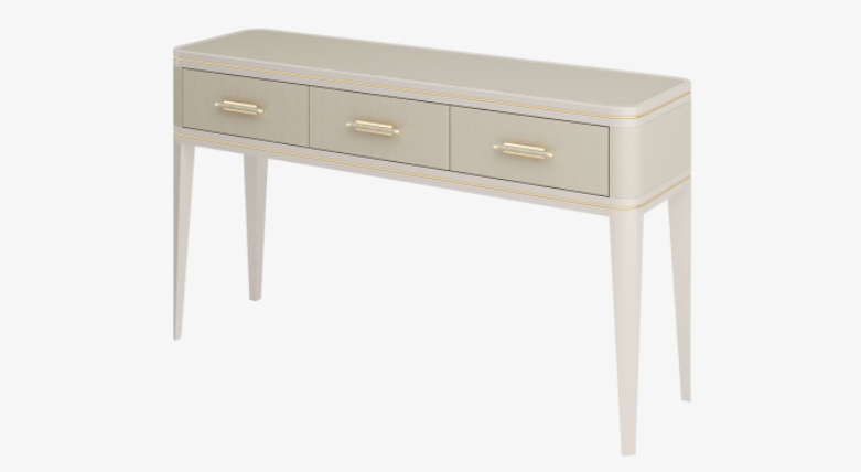 A classic design through and through, the elegantly proportioned CLICQUOT console incorporates a trio of drawers and long, tapered legs. An exquisite blend of leather, lacquered wood and brushed brass, it showcases the of pure elegance neutral hues.