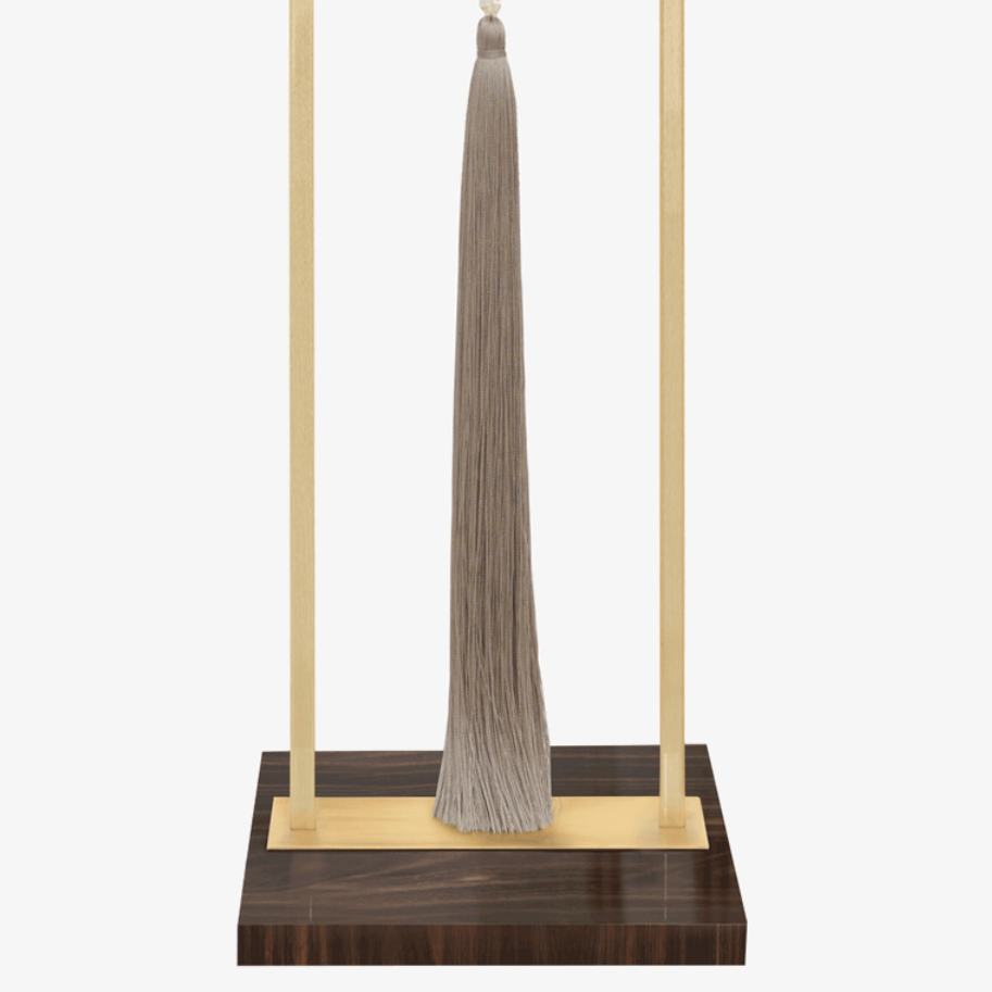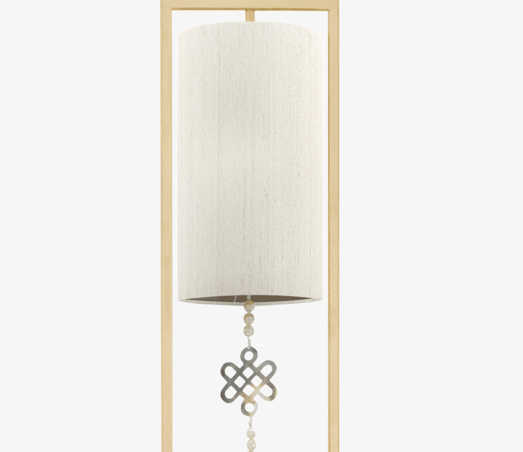 :Standing 90 centimetres tall, the gracious SAGRES lamp will add height and elegance to your table or surface. Its base of wood veneer anchors a slim frame of brushed brass, from which is suspended a double-silk shade and an ornamental pendant.