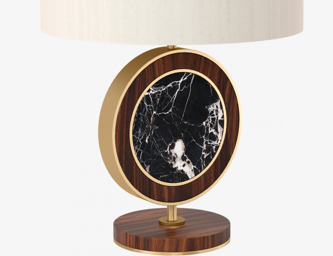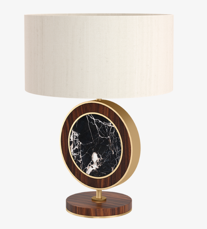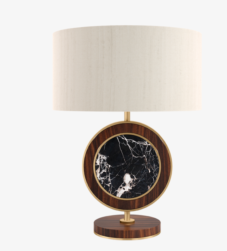 Showcasing the inherent natural beauty of three luxurious materials, the stunning TRIER table lamp layers circles of dark veined stone, polished wood veneer and brushed brass, creating a sculptural base that contrasts handsomely with a double-silk shade.