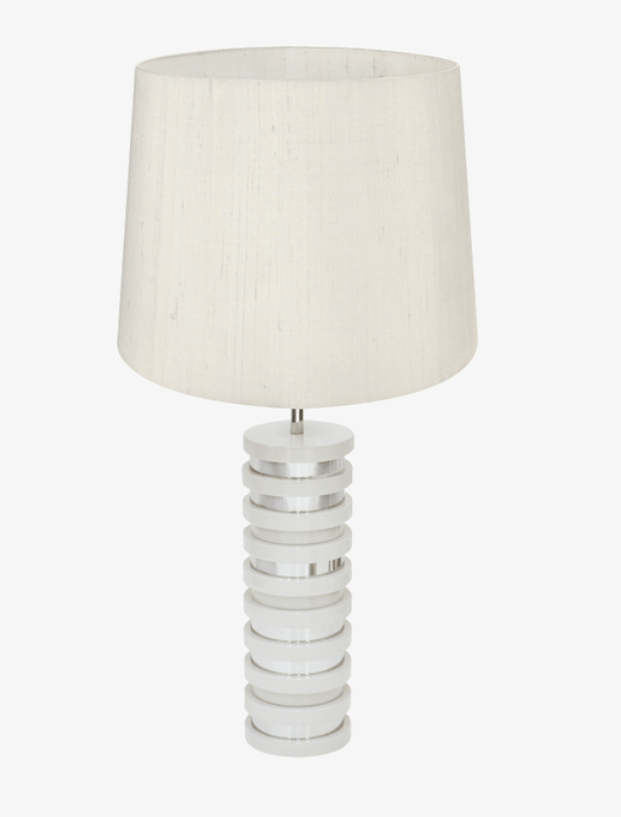 Designed to standout, the opulent VENEZA table lamp features alternating sections of white lacquered wood and light-reflecting polished stainless-steel. Topping off the design is a conical shade woven from double silk.