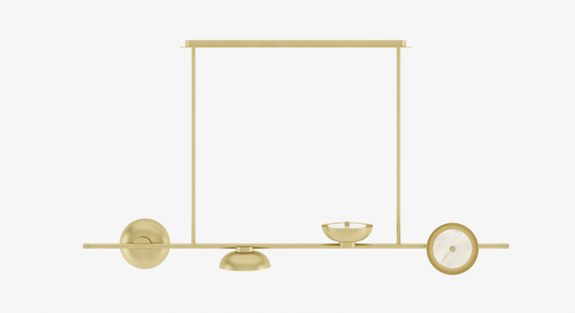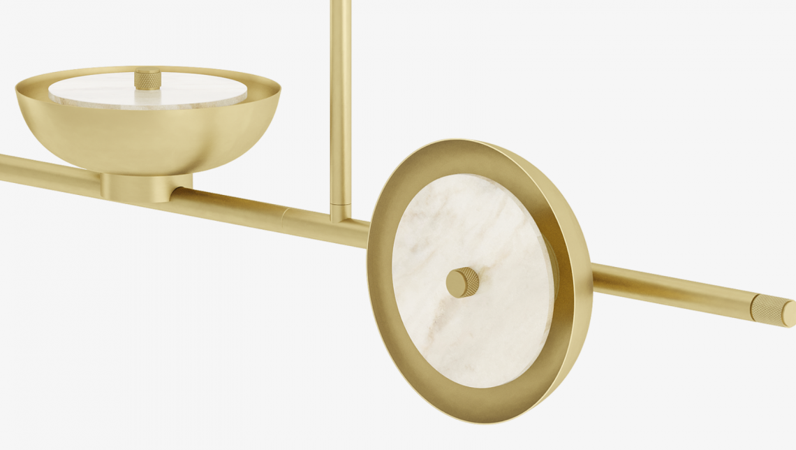 Crafted from iridescent brushed brass, the eye-catching JUNEAU ceiling lamp's four shades point in different directions