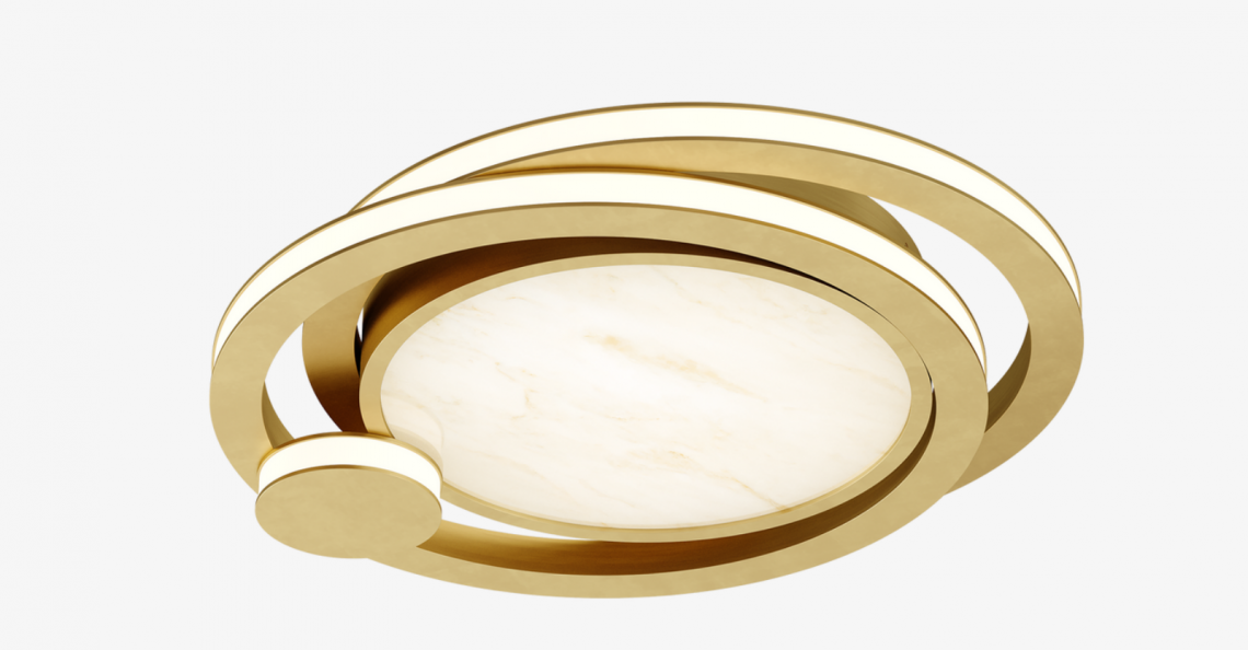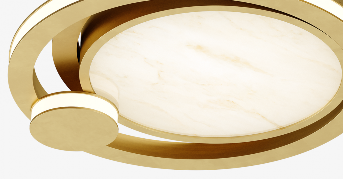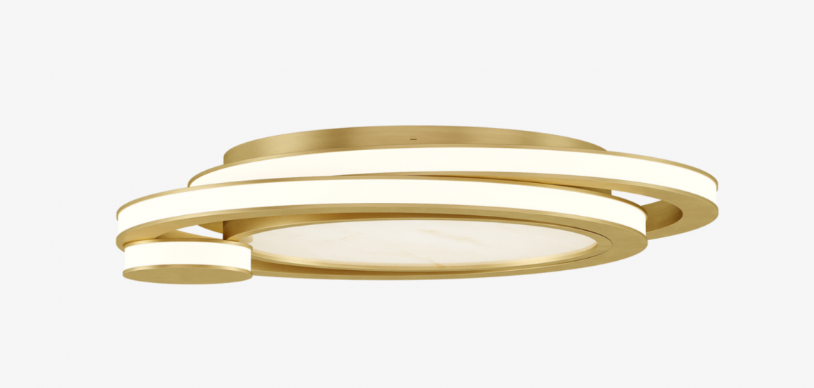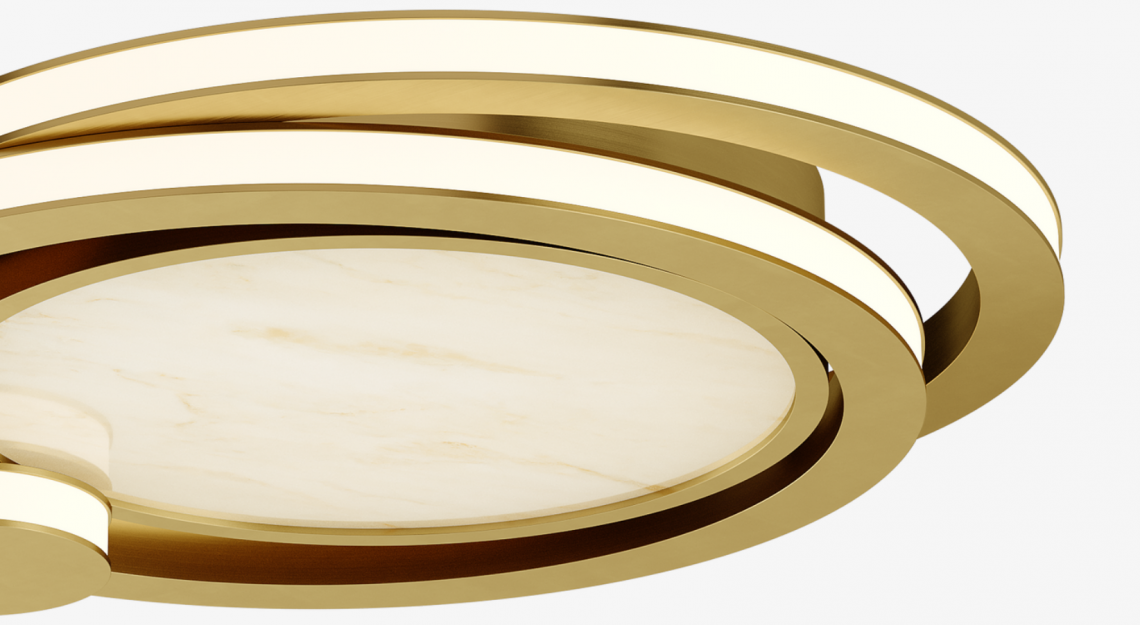 :Sitting flush to the ceiling, the QUEBEC ceiling lamp is made up of delicate overlapping circles of light that appear to orbit around a luminescent stone centre.