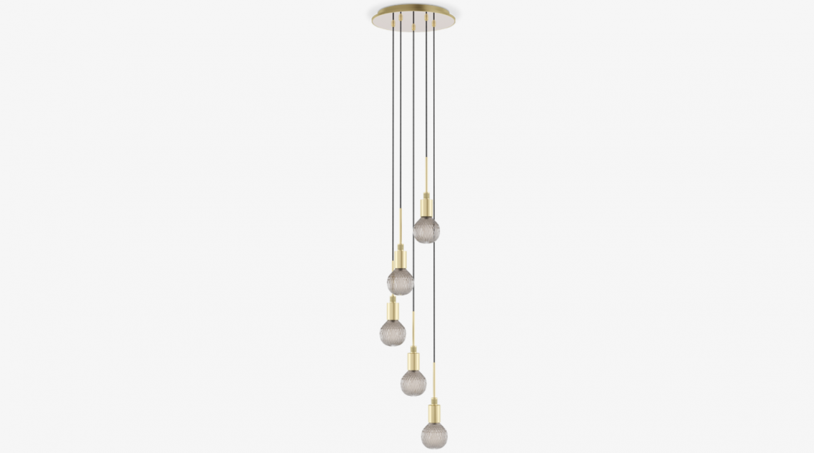 The brushed-brass TAKI ceiling lamp features a cascade of traditional-looking cut-glass bulbs that, when illuminated, cast shimmering patterns of light.