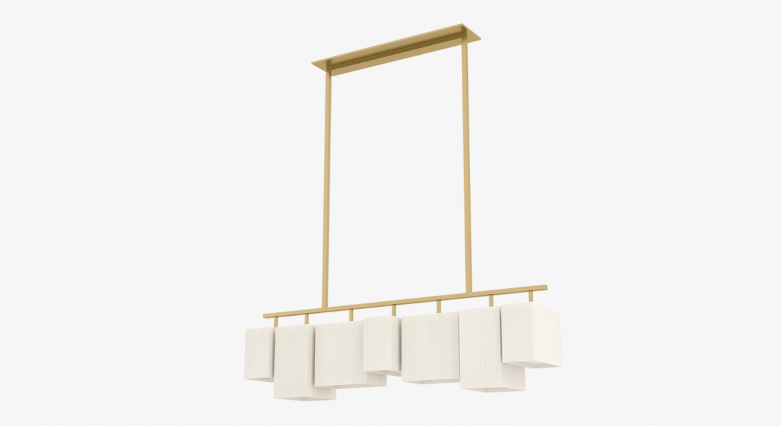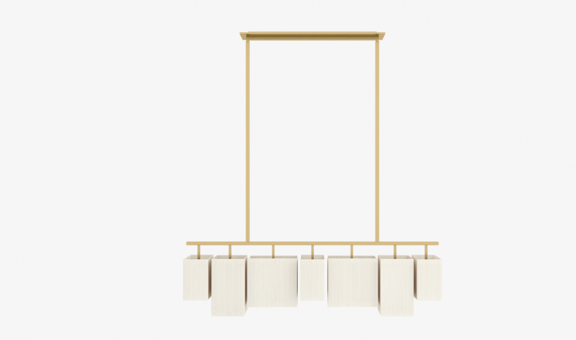 A contemporary statement ceiling lamp, the stylish TALIS design hangs from a simple brushed-brass structure. This suspends seven double-silk shades in three different cuboid shapes