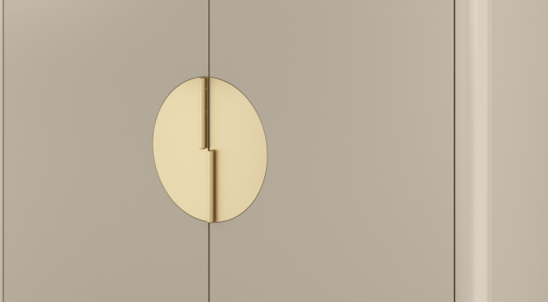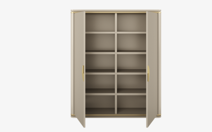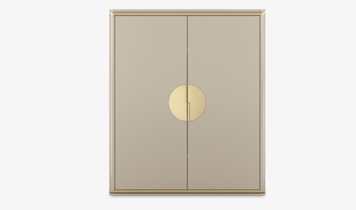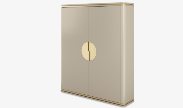 The chic BILBAO Cabinet is crafted from glossy lacquered wood and minimally embellished with details of brushed brass, which is seen on the handles as well as inset seams towards the top and bottom. Its two doors open to reveal four practical shelves.