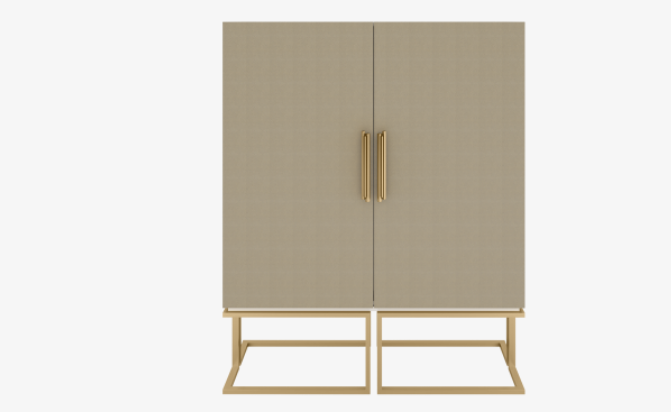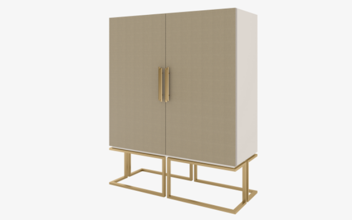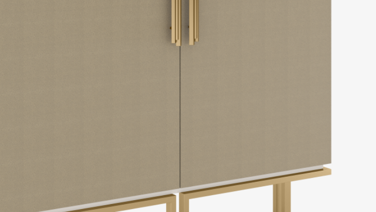 The chic MICHIGAN cabinet features a simple, lacquered rectangular box with leather-covered double doors that are elevated with sculptural handles and an architectural base, all formed from brushed brass. Inside suede-lined drawers and a bronze mirror back feature.