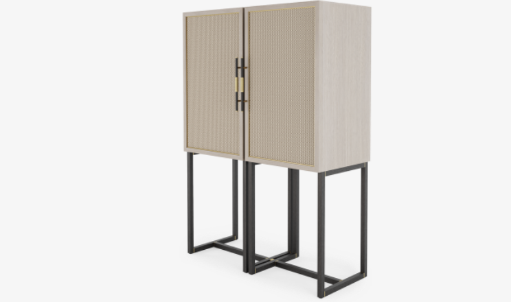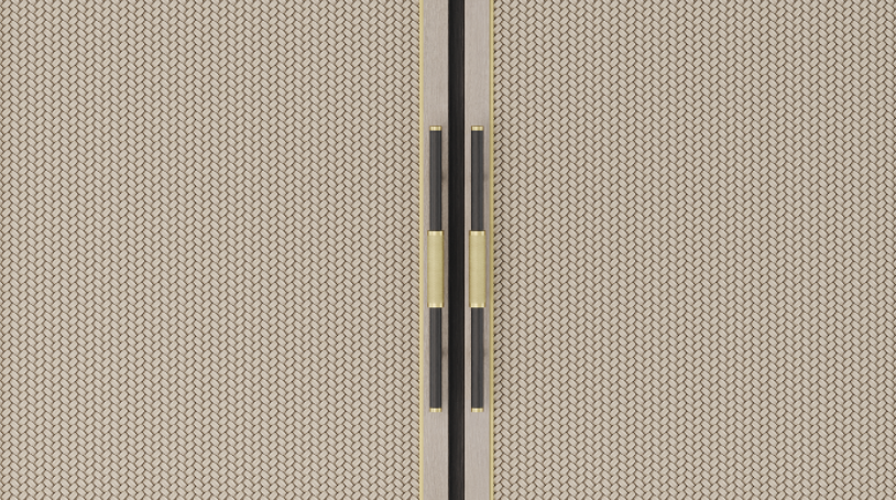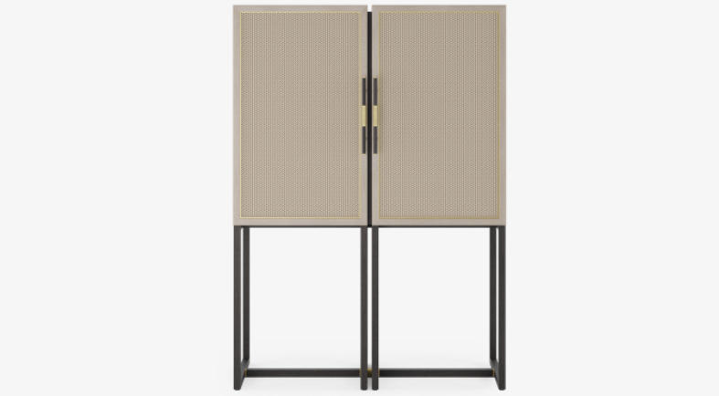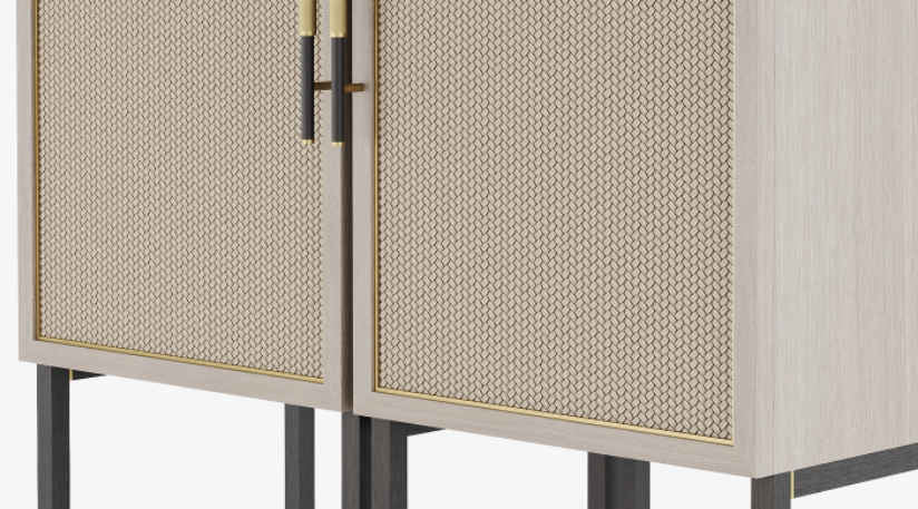 The streamlined, angular form of the two-door MYKONOS tall cabinet allows the inherent beauty of the design's material palette to come to the fore. This includes wonderfully tactile leather, dark solid wood, eye-catching brushed and knurled brass, and softly veined wood veneer.
