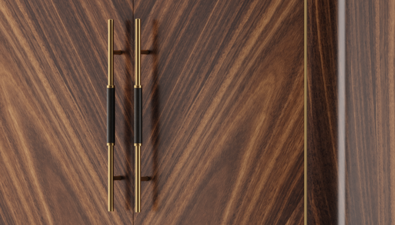 An instant classic, the SANTORINI tall cabinet takes a heritage shape and reimagines it in a way that feels refreshingly original. Flourishes include a decorative brushed-brass base brace, the choice of deeply veined wood veneer for the door fronts and the interior addition of a bronze mirror back.
