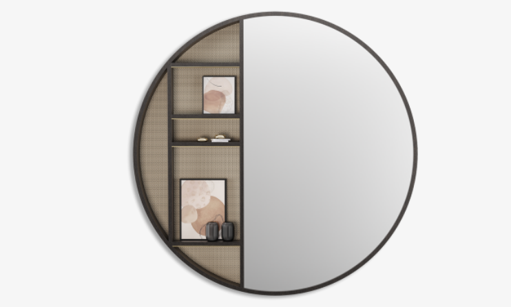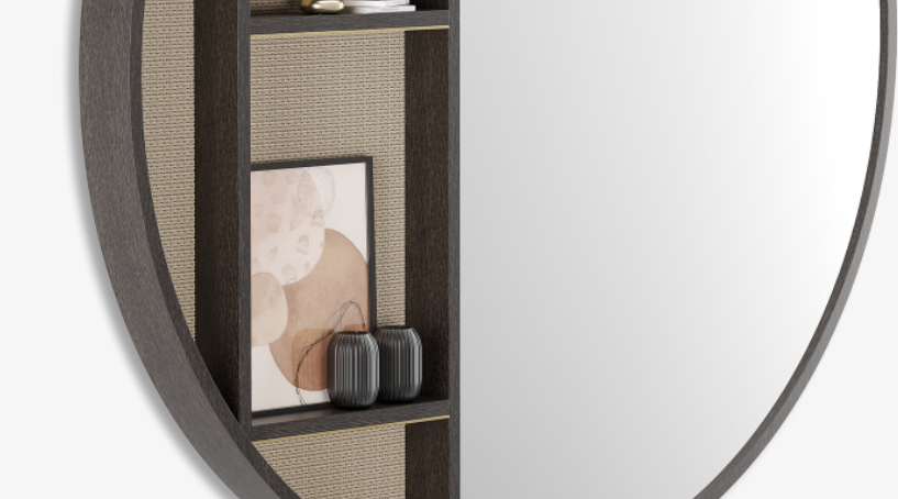 Part mirror, part display unit, the oversized BRENTWOOD is designed to make an impact. Perfect for displaying ornaments or propping artworks, the slimline shelves are crafted from wood veneer, backed with wallpaper and embellished with brushed brass.