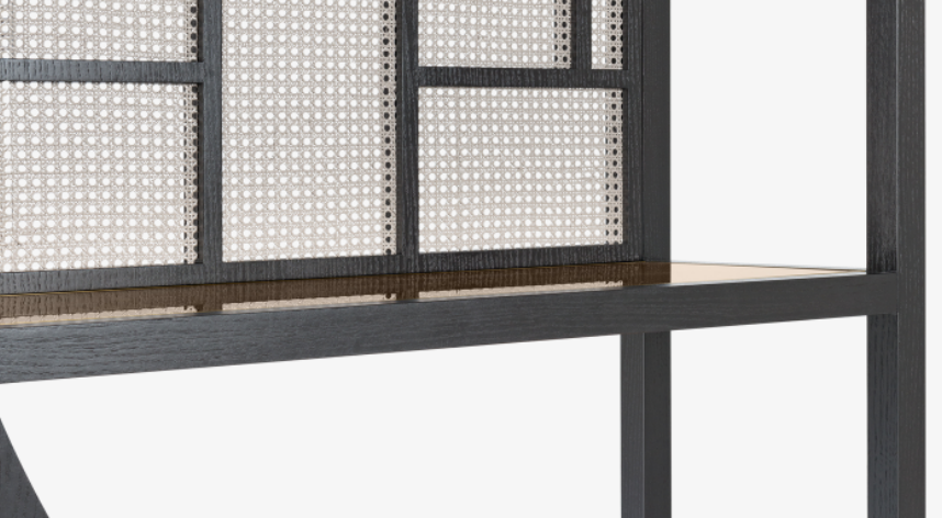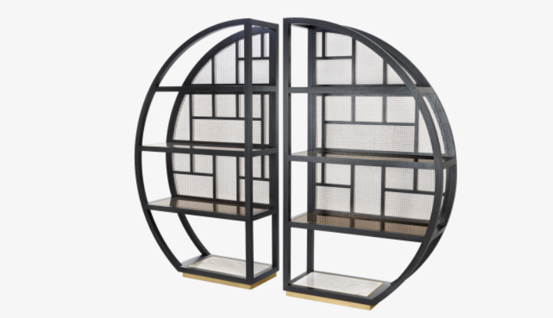 The shelves of the Orientally-influenced NARA bookcase are inlaid with bronze mirror, which gently reflects any object placed on top. This bookcase consisting of two perfectly symmetrical halves can be placed together as one or positioned apart.