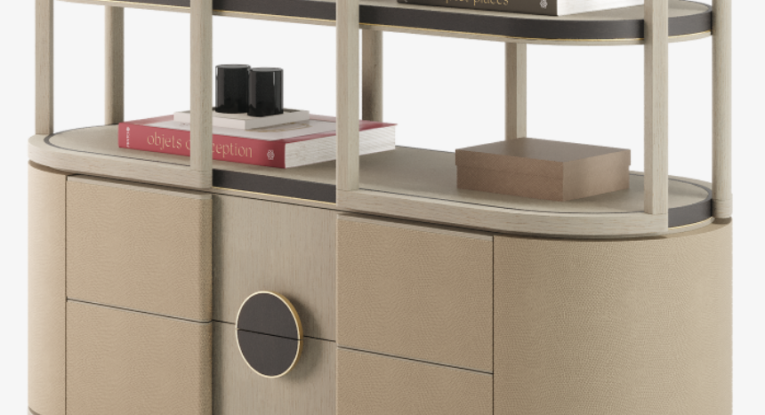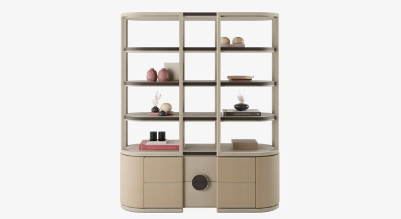 Chic details, from the solid wood supports and veneer shelves, to the leather-fronted suede-lined drawers and oversized circular handle, add a pleasing sense of symmetry to the NEW ORLEANS bookcase. Designed to be appreciated from every angle, it can also be used as a room divider.