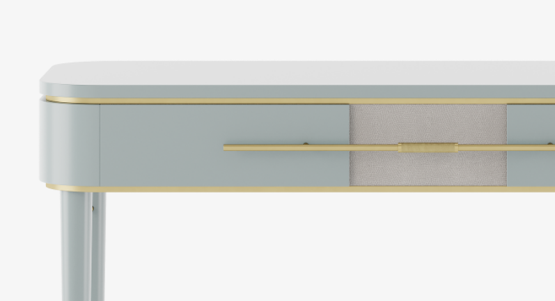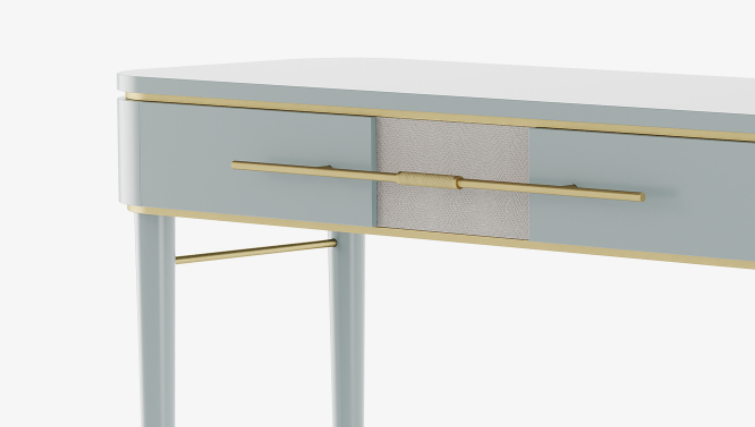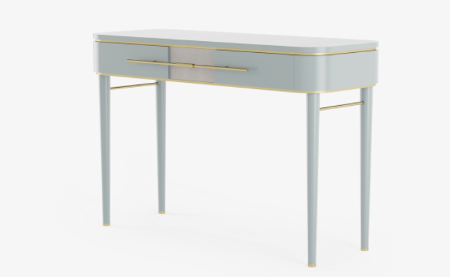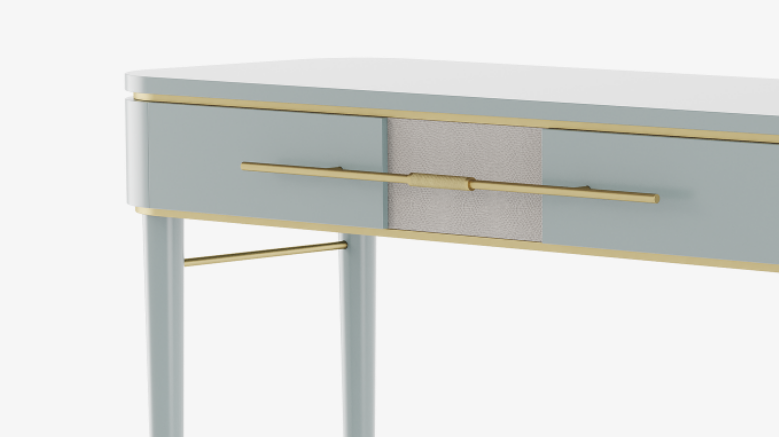 Powder blue lacquered wood distinguishes the delightful AGRA dresser, which features brushed and knurled brass details and a single, elongated drawer with leather inlay. Additionally, slender, tapered allow for a chair or stool to slot beneath.
