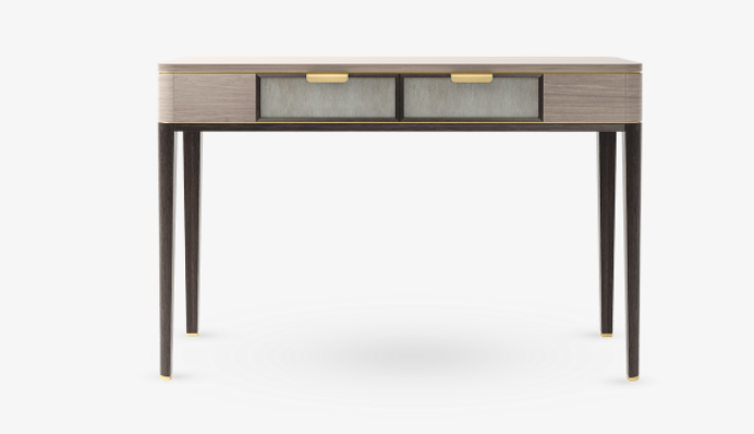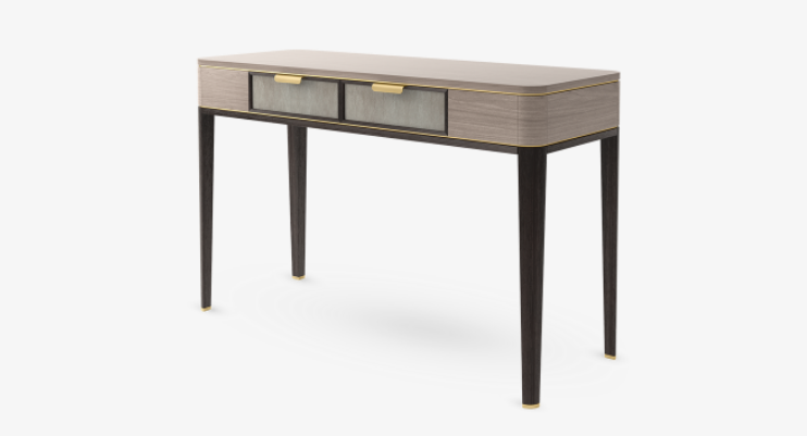A contemporary dresser with timeless appeal, the MANDALAY employs a mix of materials in subtle and interesting ways. A blend of dark solid wood and beige-toned veneer highlighted with hints of brushed brass, the two drawers are inlaid with leather and internally lined with suede.