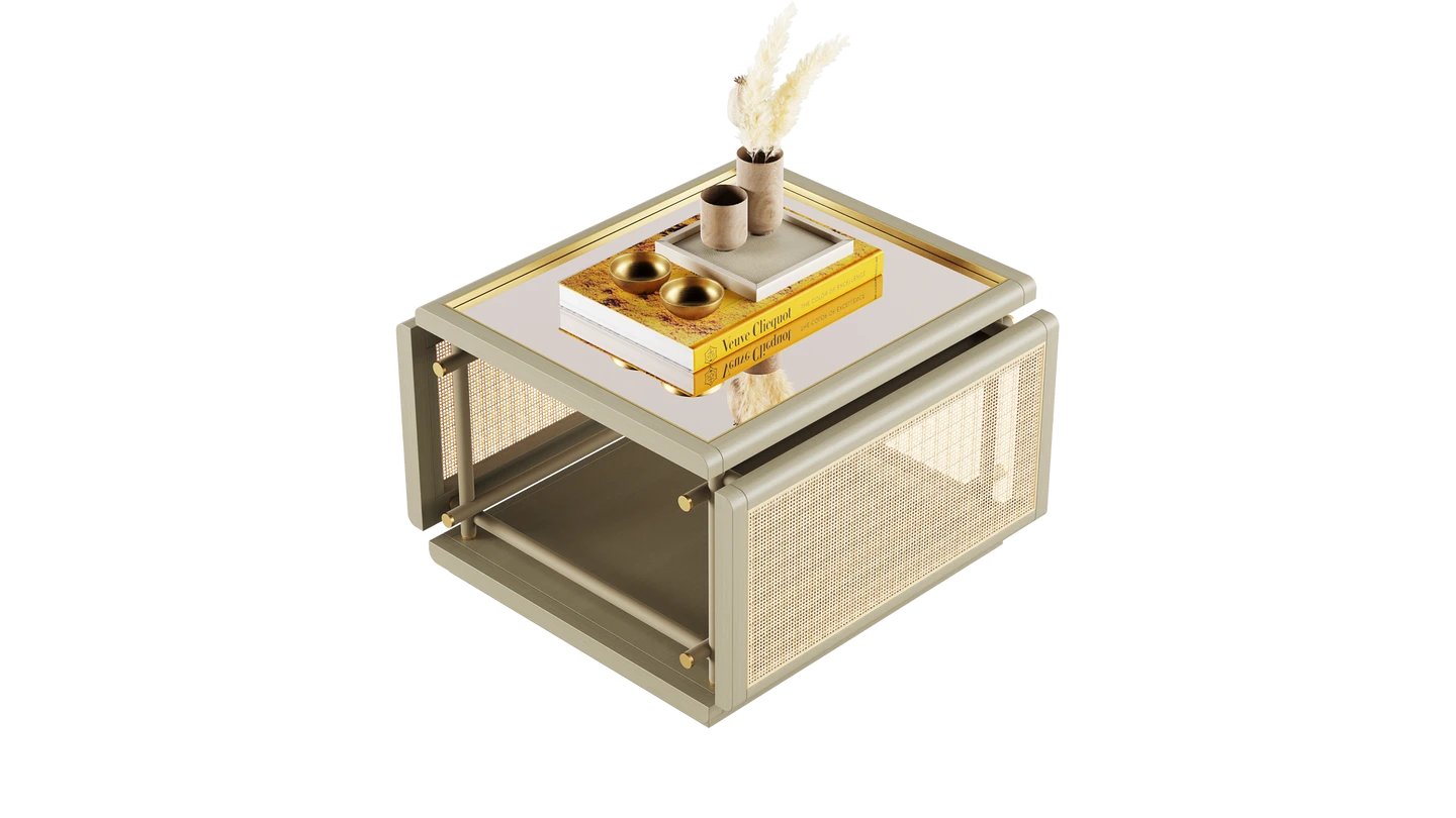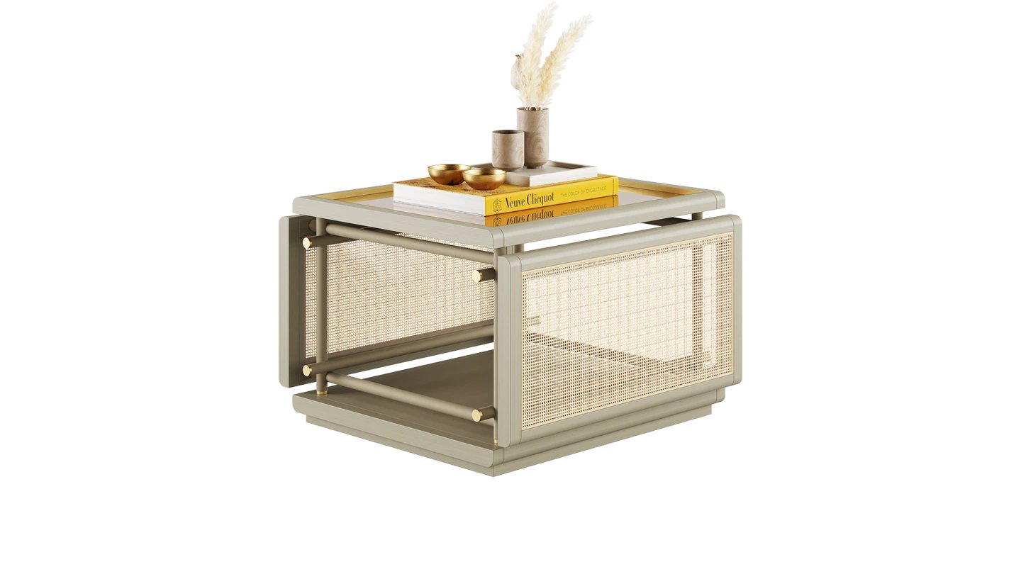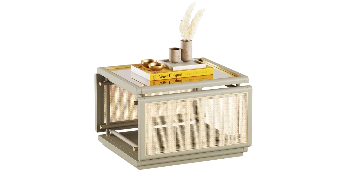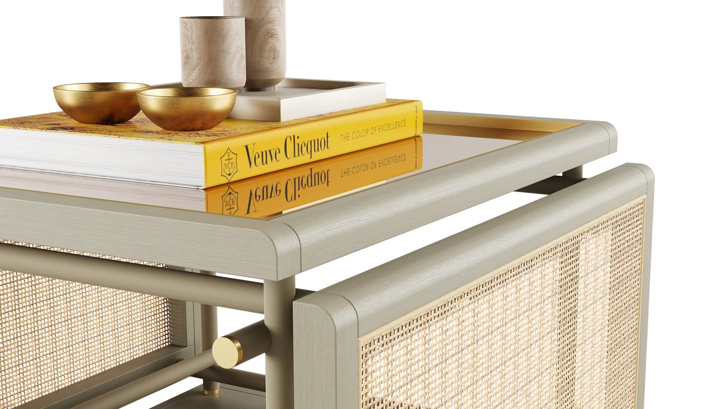 The KEA Coffee Table is a striking centrepiece, combining satin open pore wood and rattan. A bronzed mirror top and brushed brass details bring an easy air of elegance.