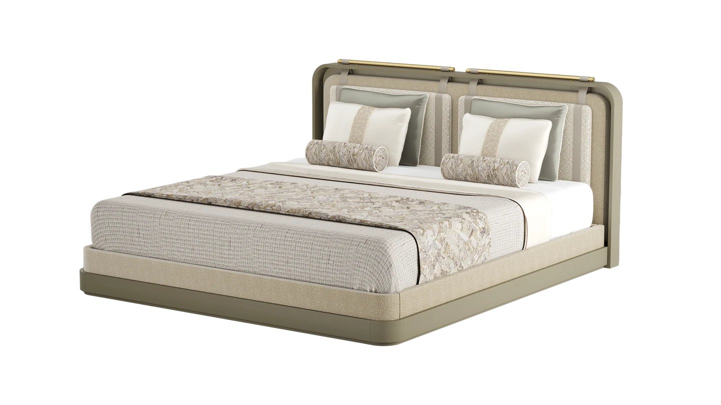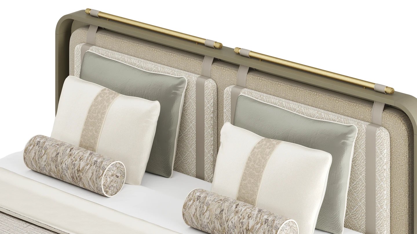 Let our LAMU Bed take centre stage in your bedroom. The commanding shape features a solid base and encompassing headboard, both finished in fabric. Leather and brushed brass details give it the perfect finish.