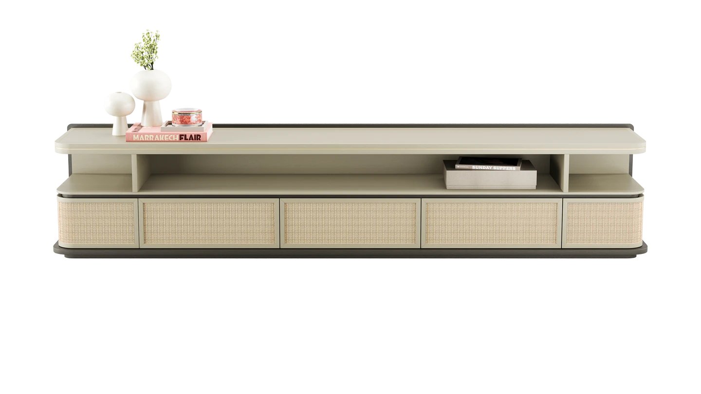 "The NAVALA TV Unit combines satin open pore wood with rattan inlays to bring a natural touch to your lounge. It combines shelves and drawer space to be as practical as it is beautiful. "