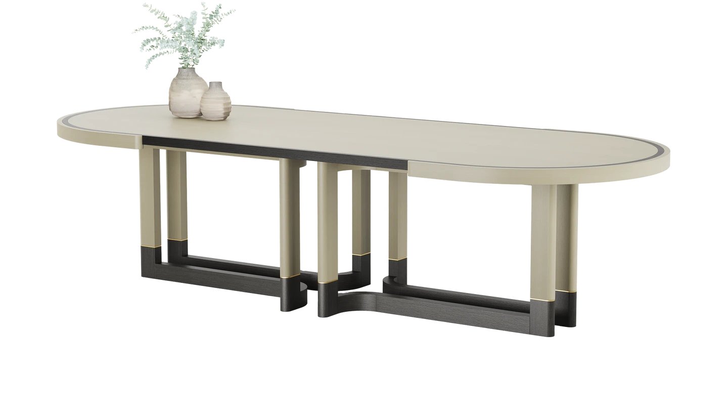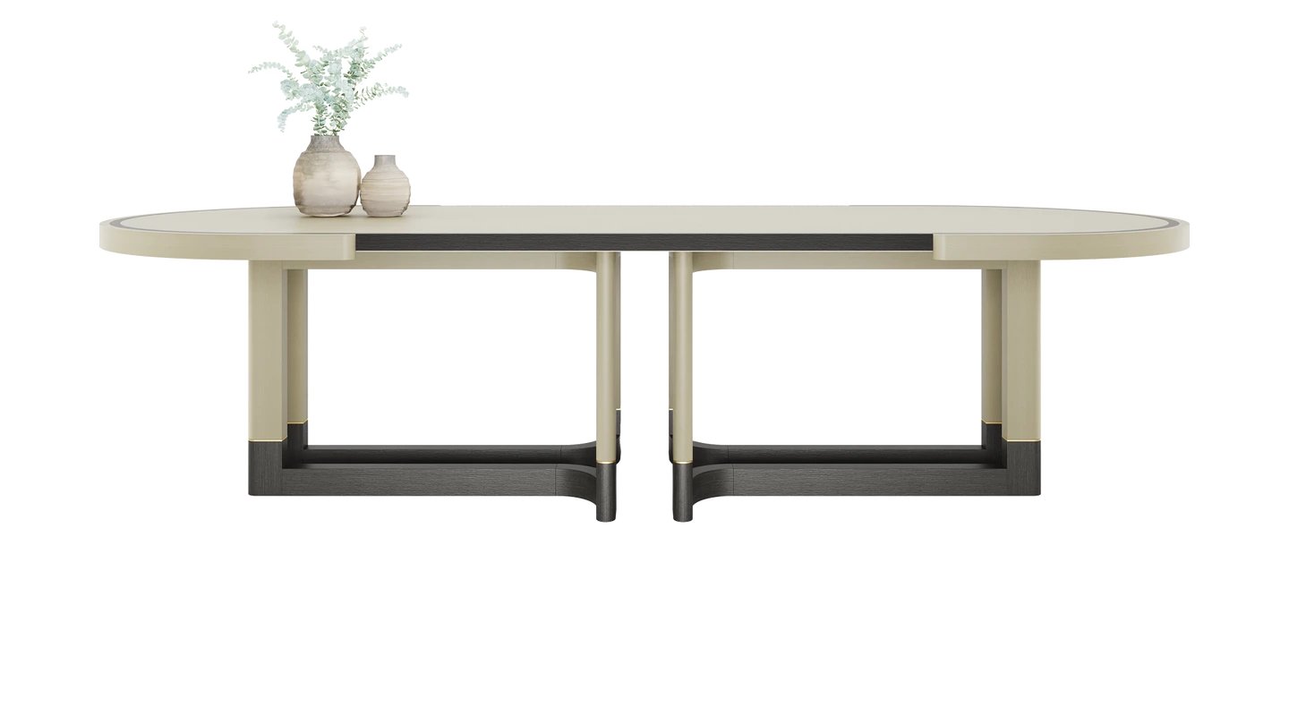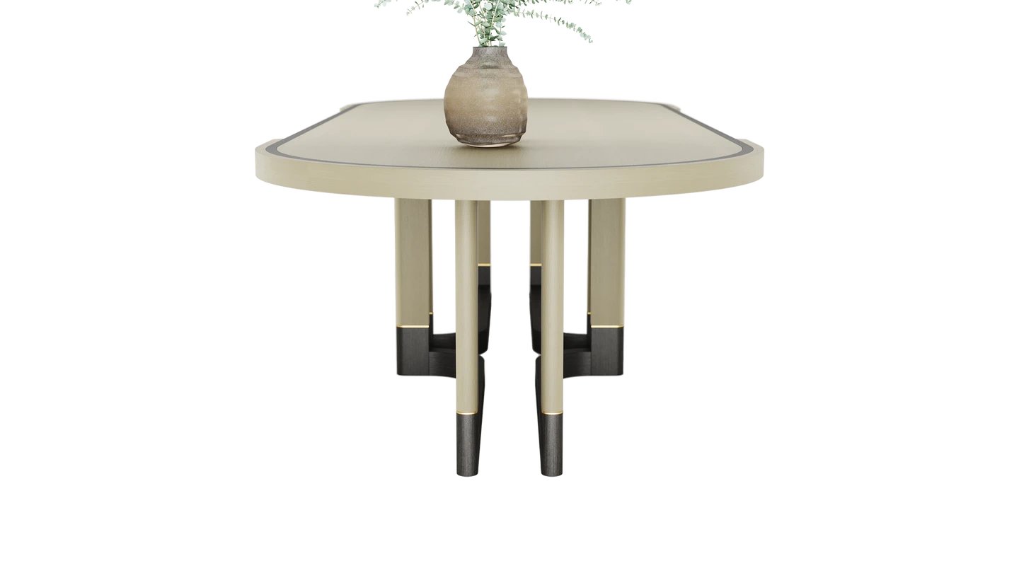 "The STOWE Dining Table takes centre stage thanks to its commanding form. The solid wood structure is amplified by soft details such as subtly curved legs and brushed brass highlights. "