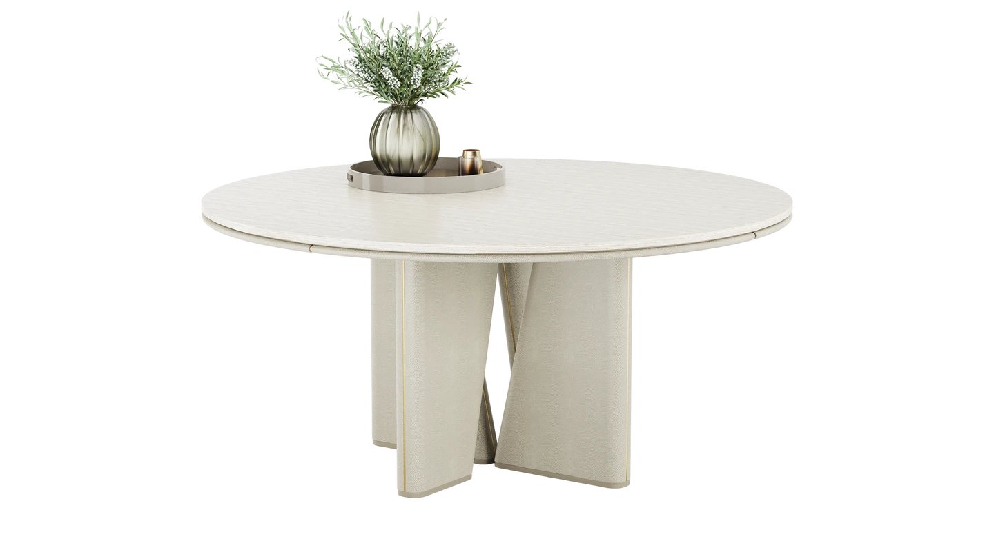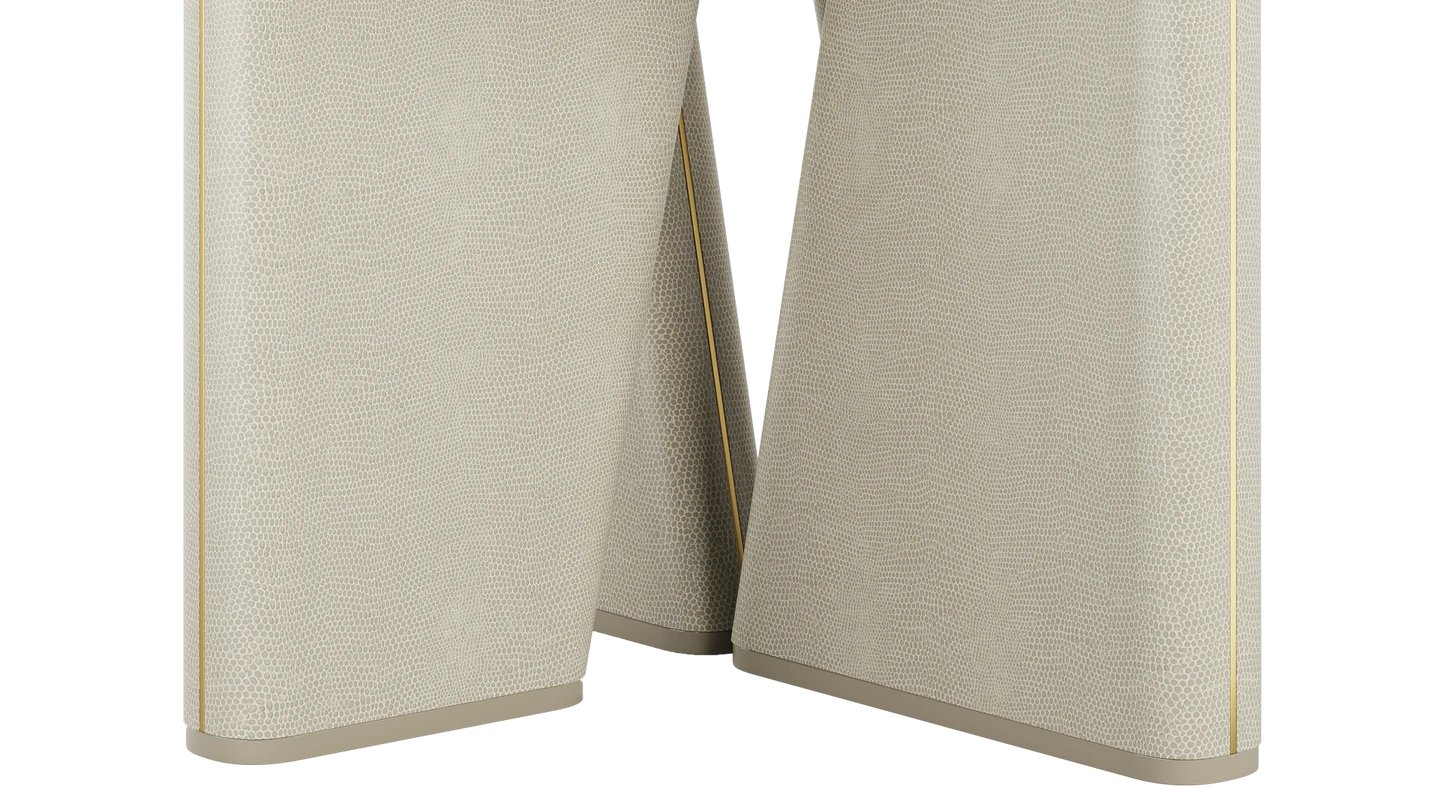 Our TORTONA Dining Table is a true masterpiece. A sleek stone top sits atop artistically sloped lacquered-wood legs, creating a commanding shape. It’s finished with leather and brushed brass detailing.