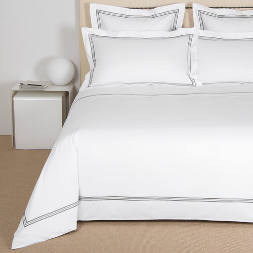 Soft and smooth with high shine, the Triplo Bourdon Duvet Cover is crafted from pure cotton poplin and embellished with a three-line embroidery.