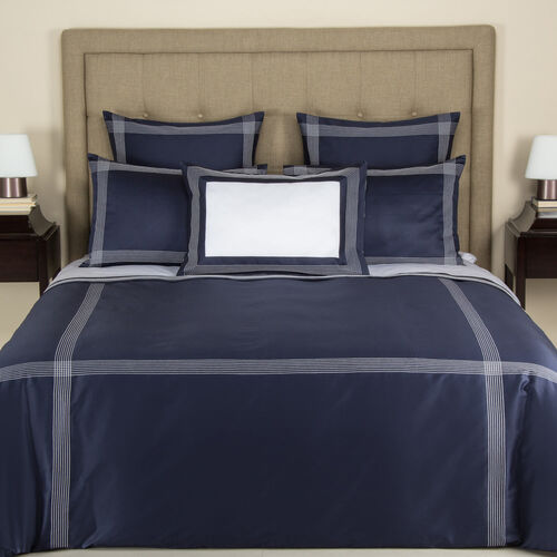 A contemporary Sheet Set from the Porto bedlinen range crafted in soft cotton sateen and finished with simple stitched hems. The upper sides of the pillowcases feature solid colour backgrounds with borders of narrow contrasting stripes while the undersides are plain.